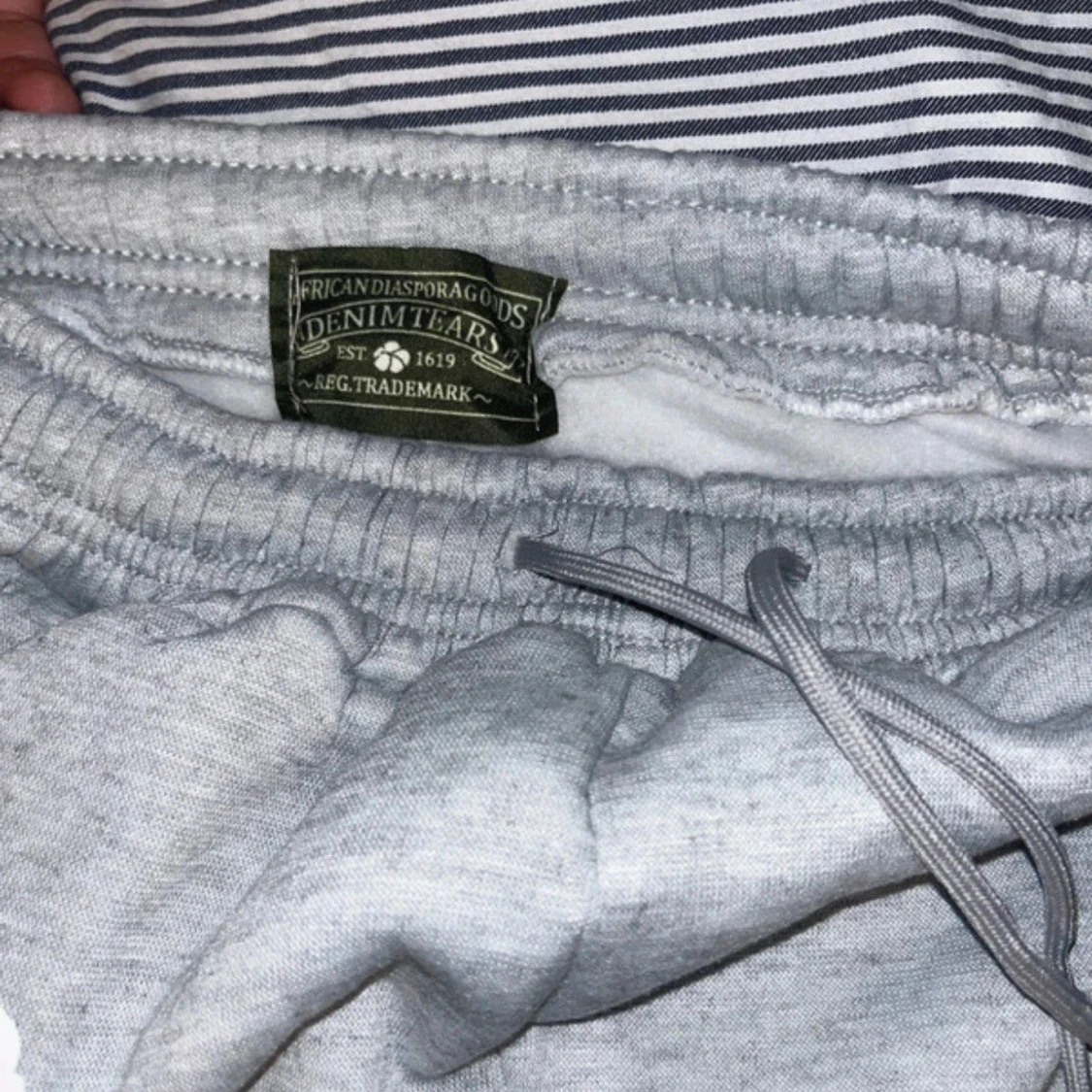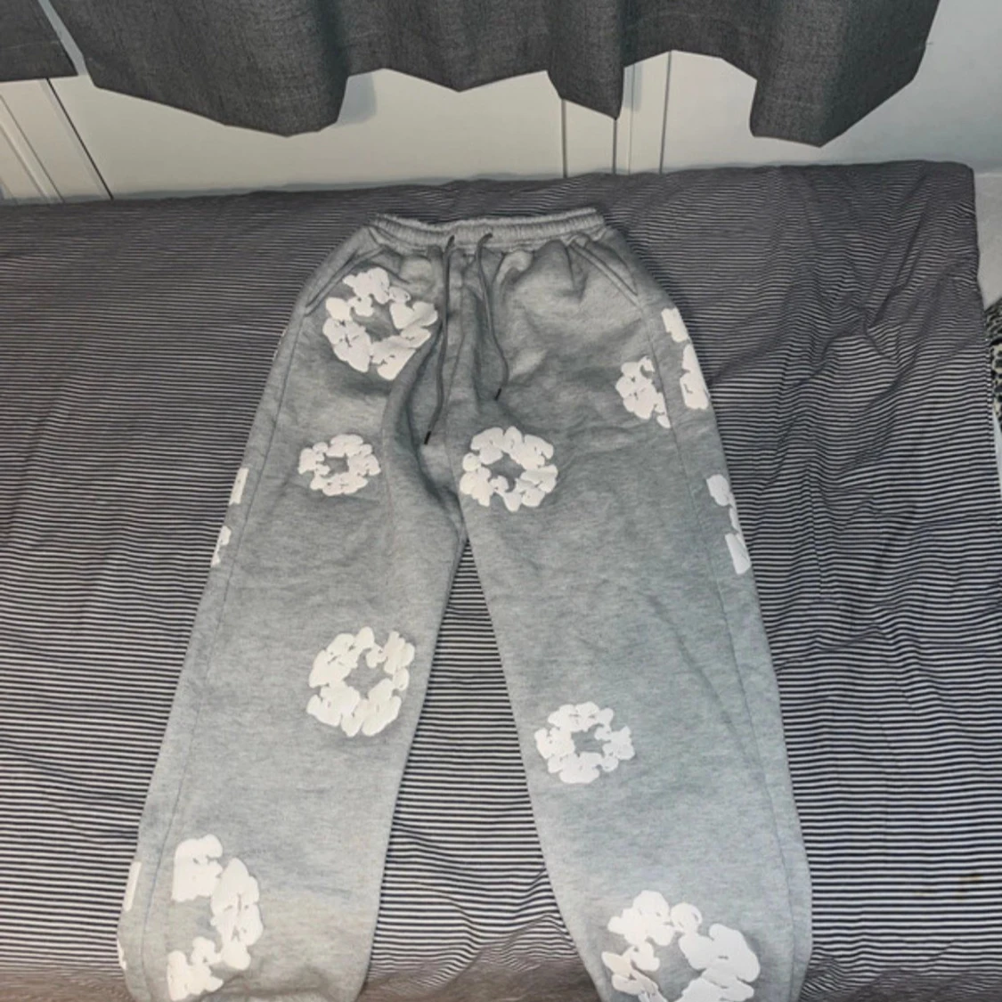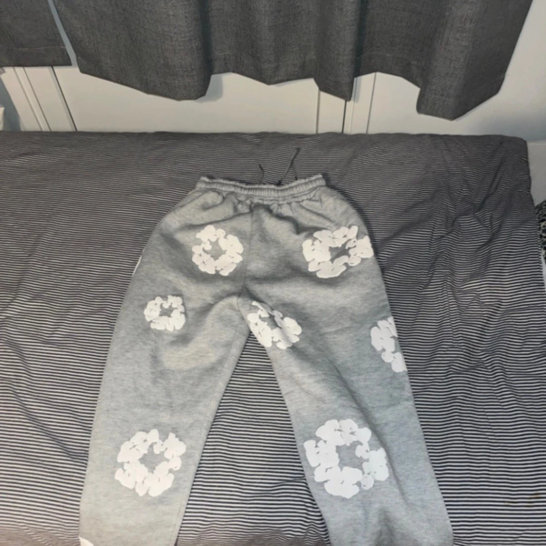 Grå mjukisbyxor från Denim Tears med vita blommönster över hela byxorna. Byxorna har resår och snörning i midjan för skön passform. Perfekta för chill dagar och streetwear-stil.