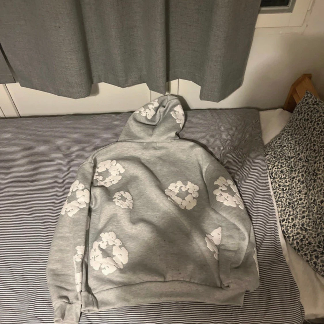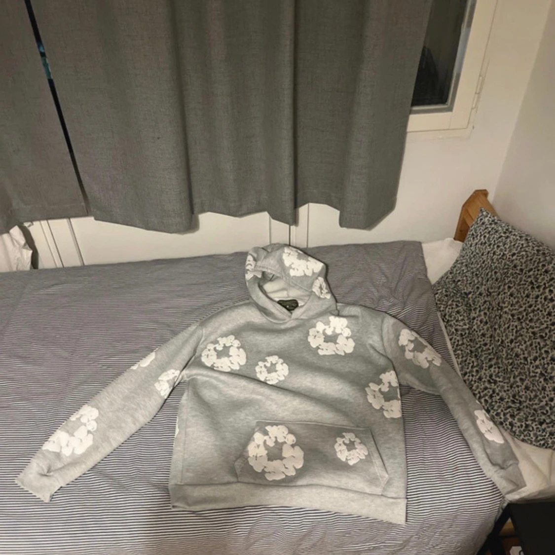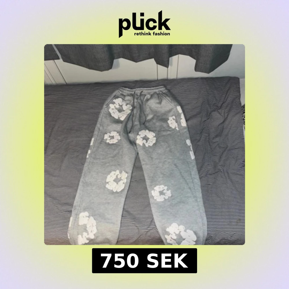 Grå mjukisbyxor från Denim Tears med vita blommönster över hela byxorna. Byxorna har resår och snörning i midjan för skön passform. Perfekta för chill dagar och streetwear-stil.