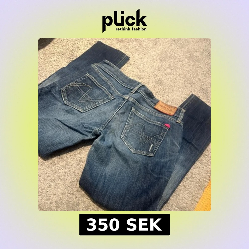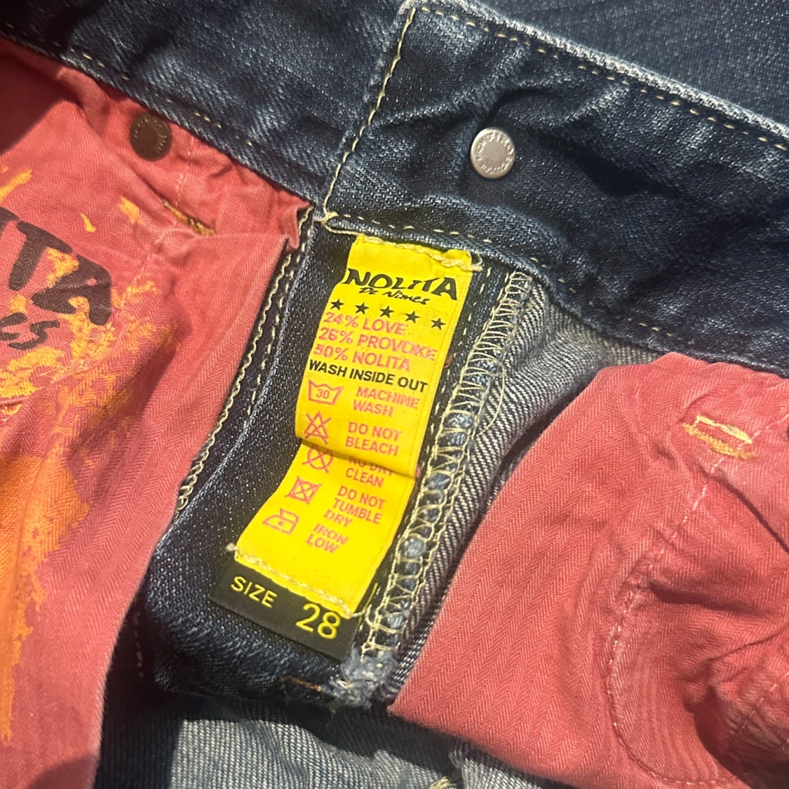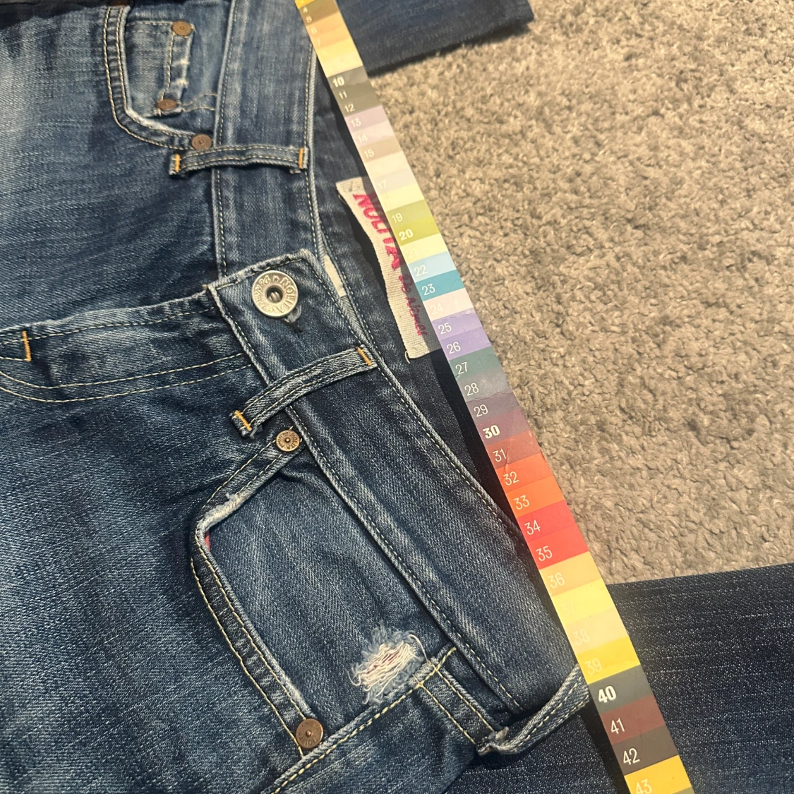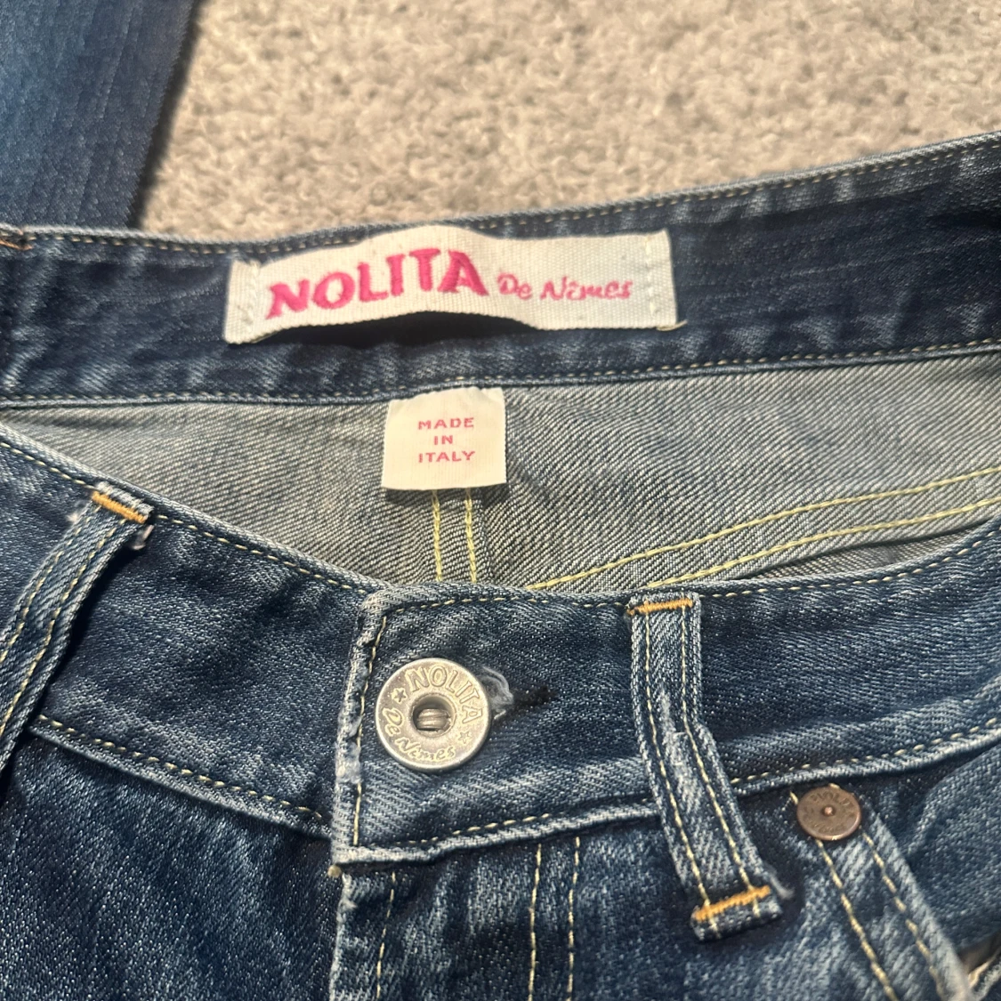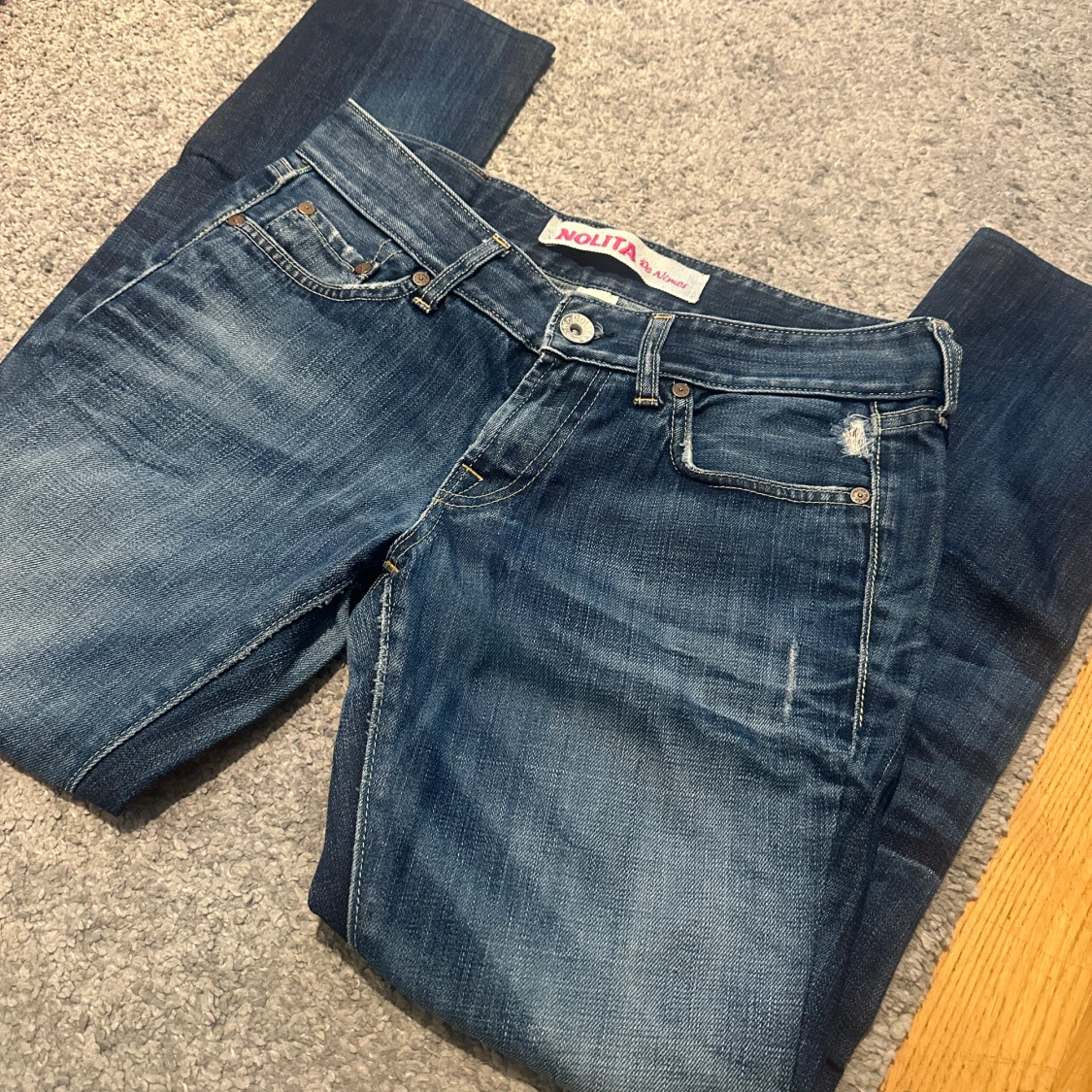 Snygga blå jeans från Nolita med klassisk femficksmodell och coola slitningar framtill. Jeansen har raka ben, kontrastsömmar och en liten rosa detalj på bakfickan. Tillverkade i Italien och i mjukt jeanstyg. Midja - se bild, Innerbenslängd 70 cm. Storlek ca 28 28
