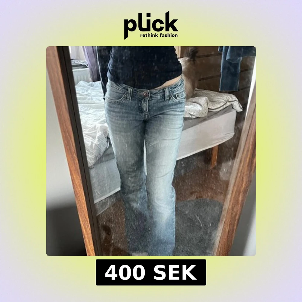 Snygga blå low waist jeans med en klassisk bootcut-stil och tvätt fram samt över rumpan. De har en bekväm passform och är i bra skick. Passar bra till 160cm ish! Jag är 157.