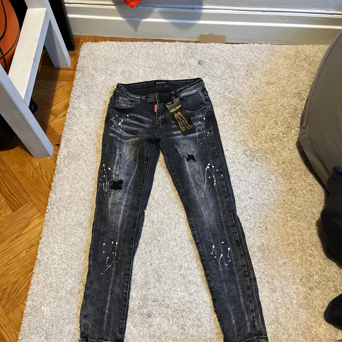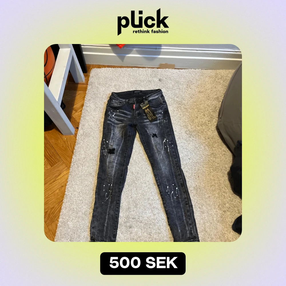 Säljer ett par svarta jeans med coola slitningar och vita färgstänk. De har en tight passform och är perfekta för en avslappnad stil. Jeansen har en klassisk femficksdesign och är i bra skick. Perfekta för både vardag och fest!