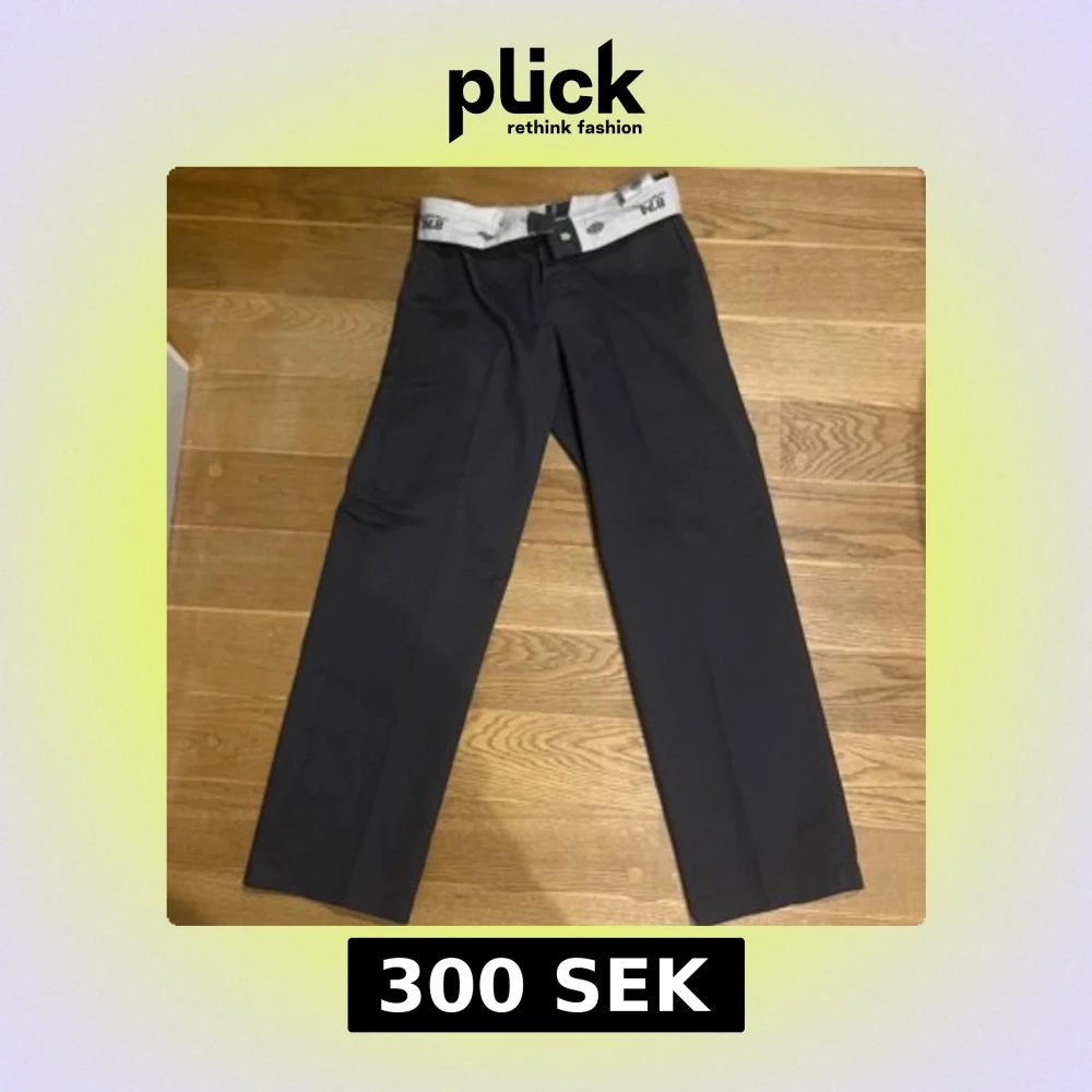 Väldigt bekväma och stilrena byxor från Dickies. Dom är mörkgrå och aldrig använda. Sitter som ett par kostymbyxor 💗 Passar både tjej och kille. Midja 28 cm, Längd 30 cm. Ungefär storlek M skulle jag tippa på.