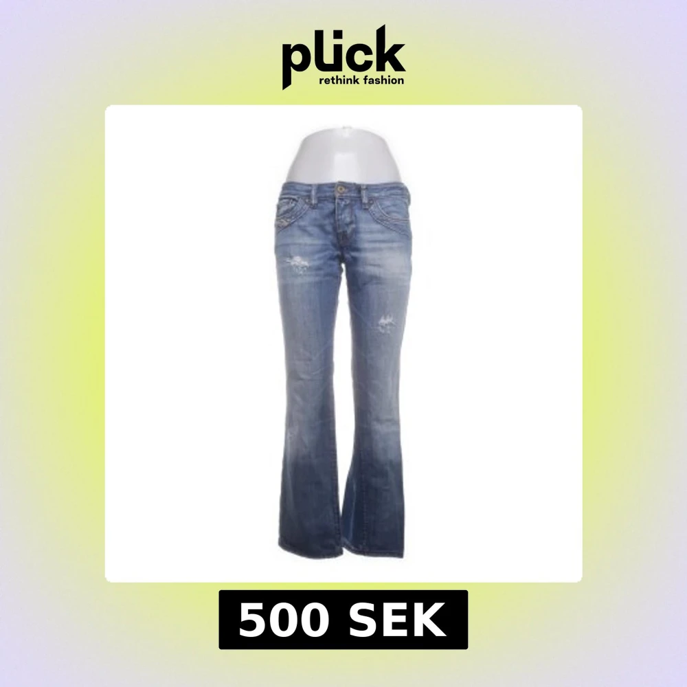 Snygga blå bootcut jeans från Diesel med slitna detaljer. 💞 Säljer pågrund att det tyvärr var försmå. Aldrig använda men köpt från Sellpy, skicket är mycket bra! Jag skulle säga att dem är mindre i storleken, typ 26/27 inte 28.