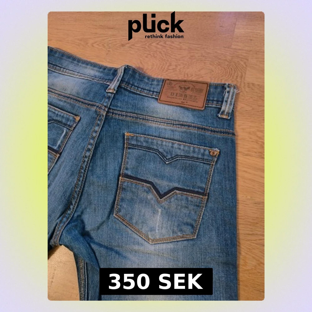 Säljer ett par klassiska blå jeans från Diesel med snygga slitningar och raka ben. Jeansen har fem fickor, tydliga kontrastsömmar och en läderpatch med Diesel-logga bak. Passar dig som gillar en avslappnad och tidlös stil.