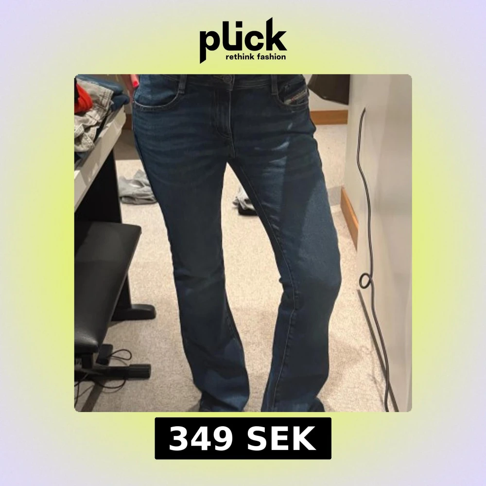 Snygga blå jeans från Diesel med klassisk bootcut-passform och fem fickor. Jeansen har en mörk tvätt med lätt slitning och detaljerad logotyp på fickan. Perfekt för dig som gillar en tidlös och cool stil. Materialet är mjukt jeans och midjan är normal.