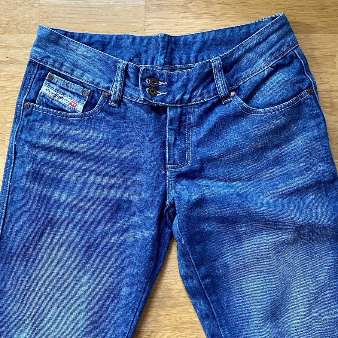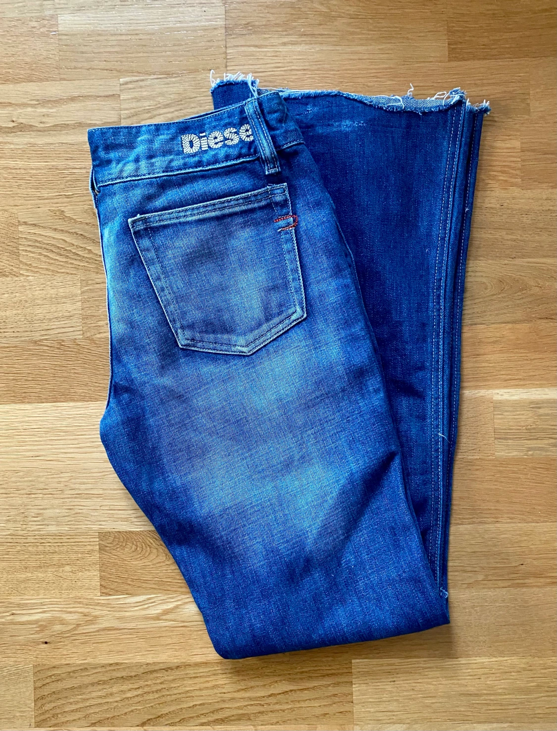 Superfina Diesel jeans med låg midja. Har blivit sönderklippta i knä samt avklippta ben. Mått: Midja ca 80cm Innerbenslängd 78cm Märkta storlek 30 men små i storleken. Snarare 27-28.