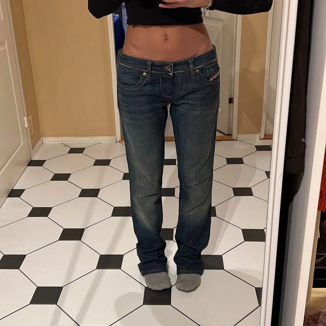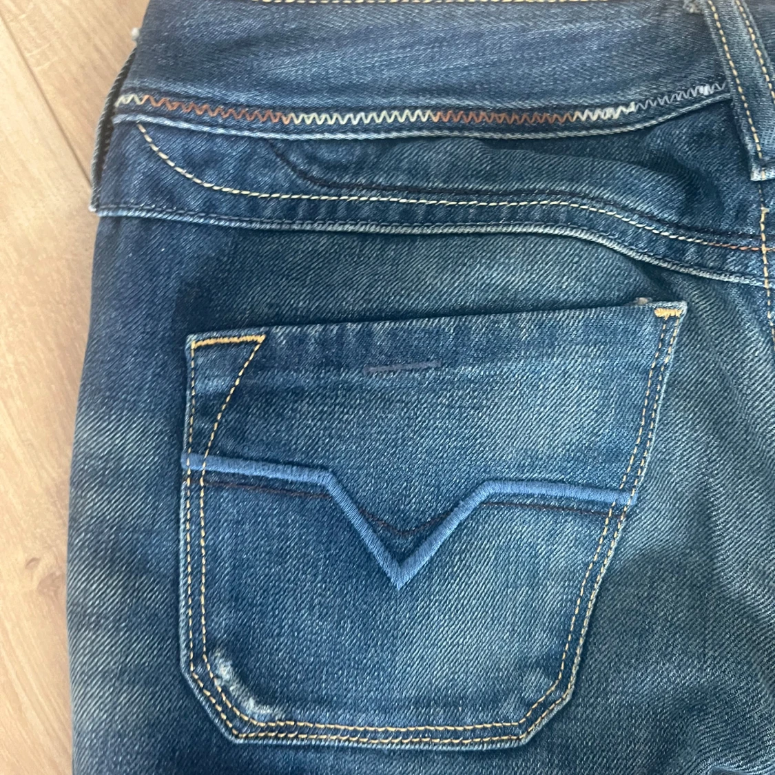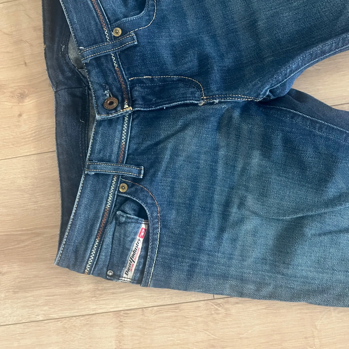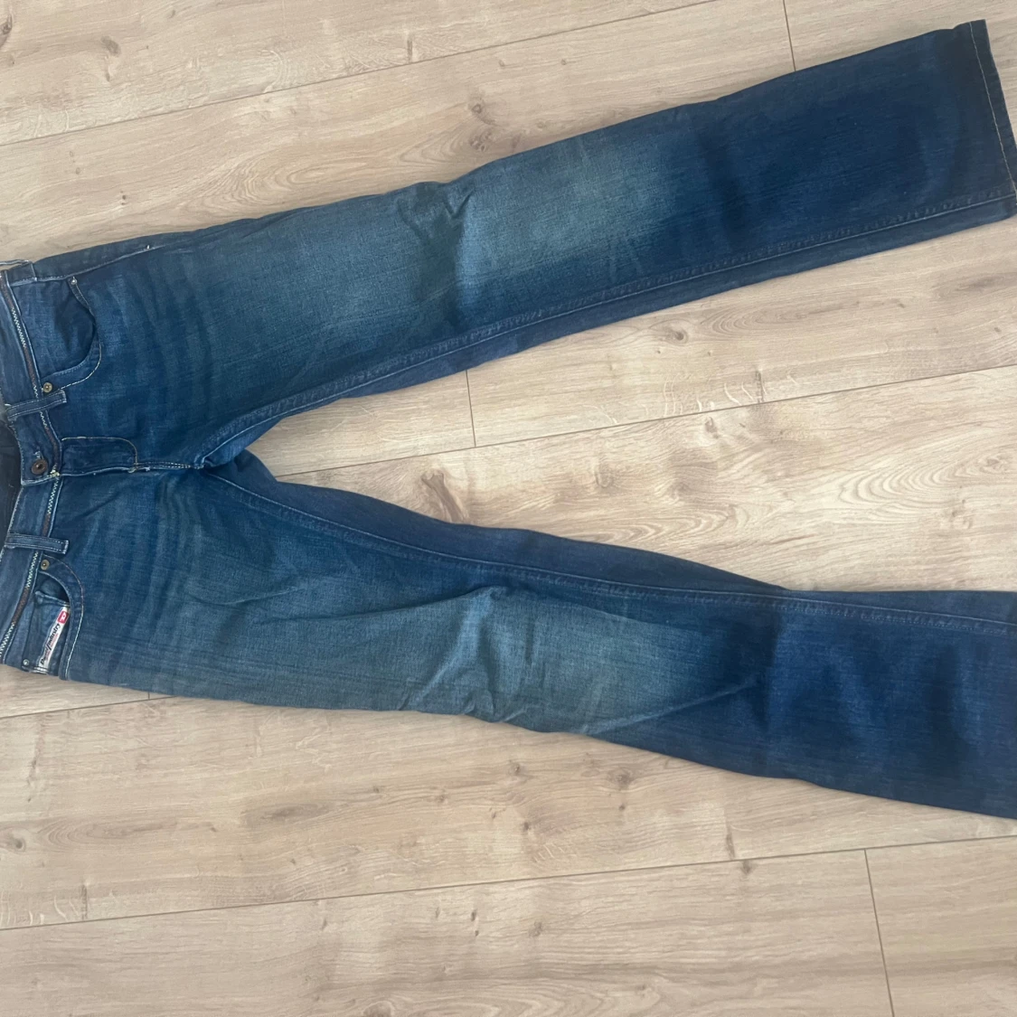 Säljer ett par klassiska blå Diesel Larkee jeans med låg midja. Jeansen har snygga slitningar och detaljerade sömmar, samt den ikoniska Diesel-loggan vid fickan. Perfekta för dig som gillar en avslappnad och tidlös look😇