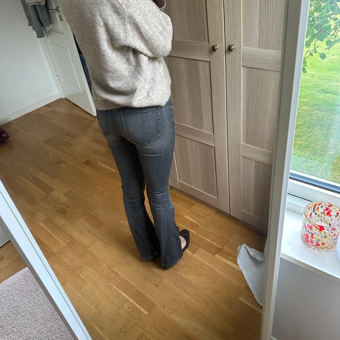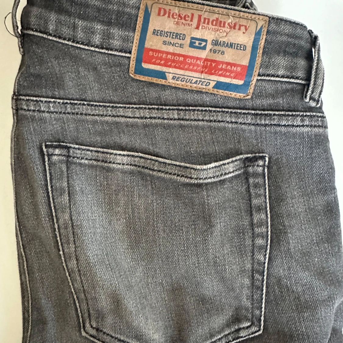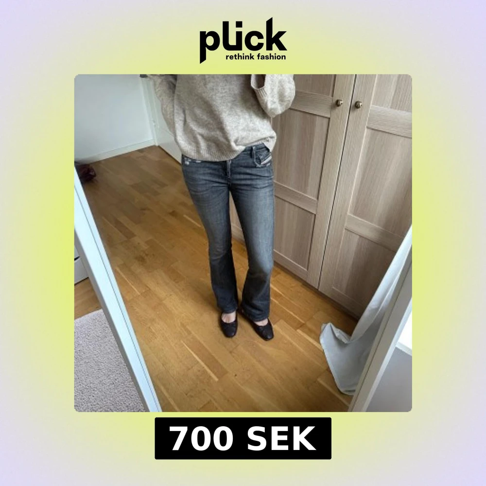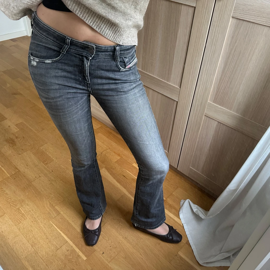 Snygga grå jeans från Diesel med bootcut passform och låg midja. Jeansen har klassiska fem fickor, slitna detaljer och tydliga sömmar. Perfekta för dig som gillar en avslappnad men ändå trendig look.