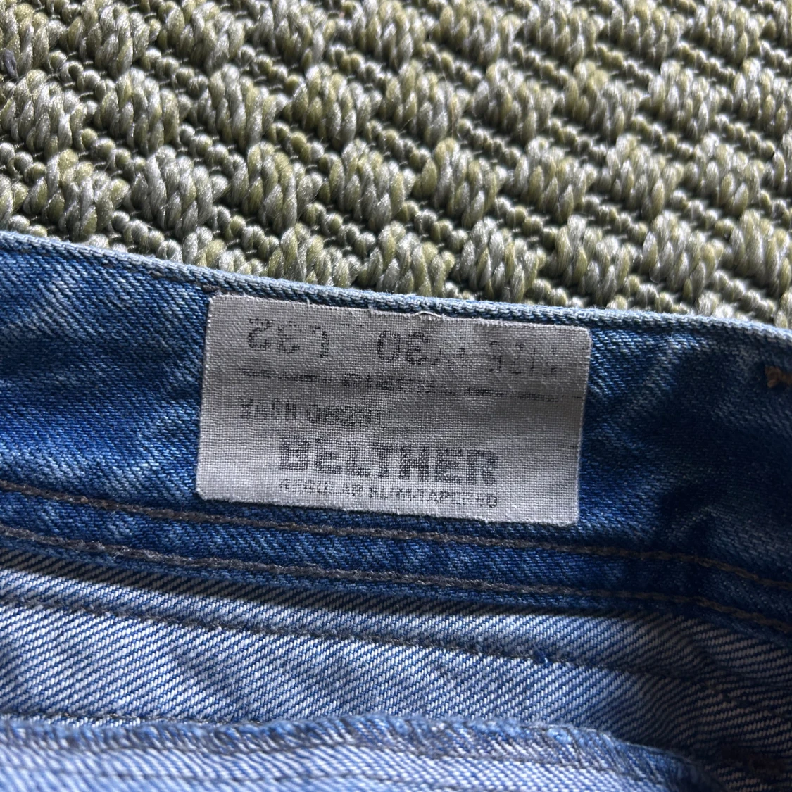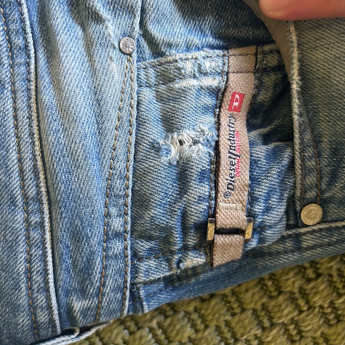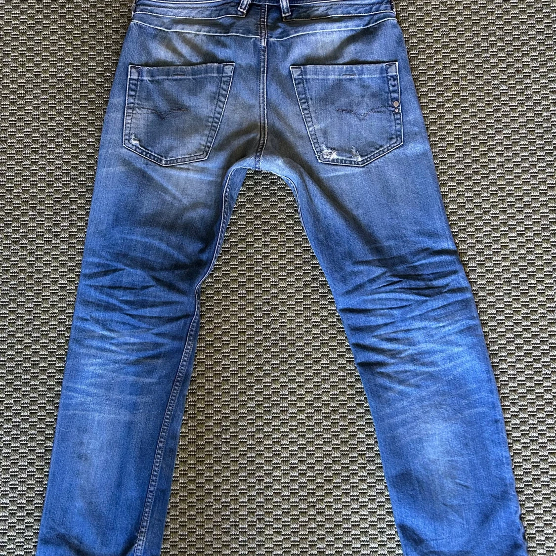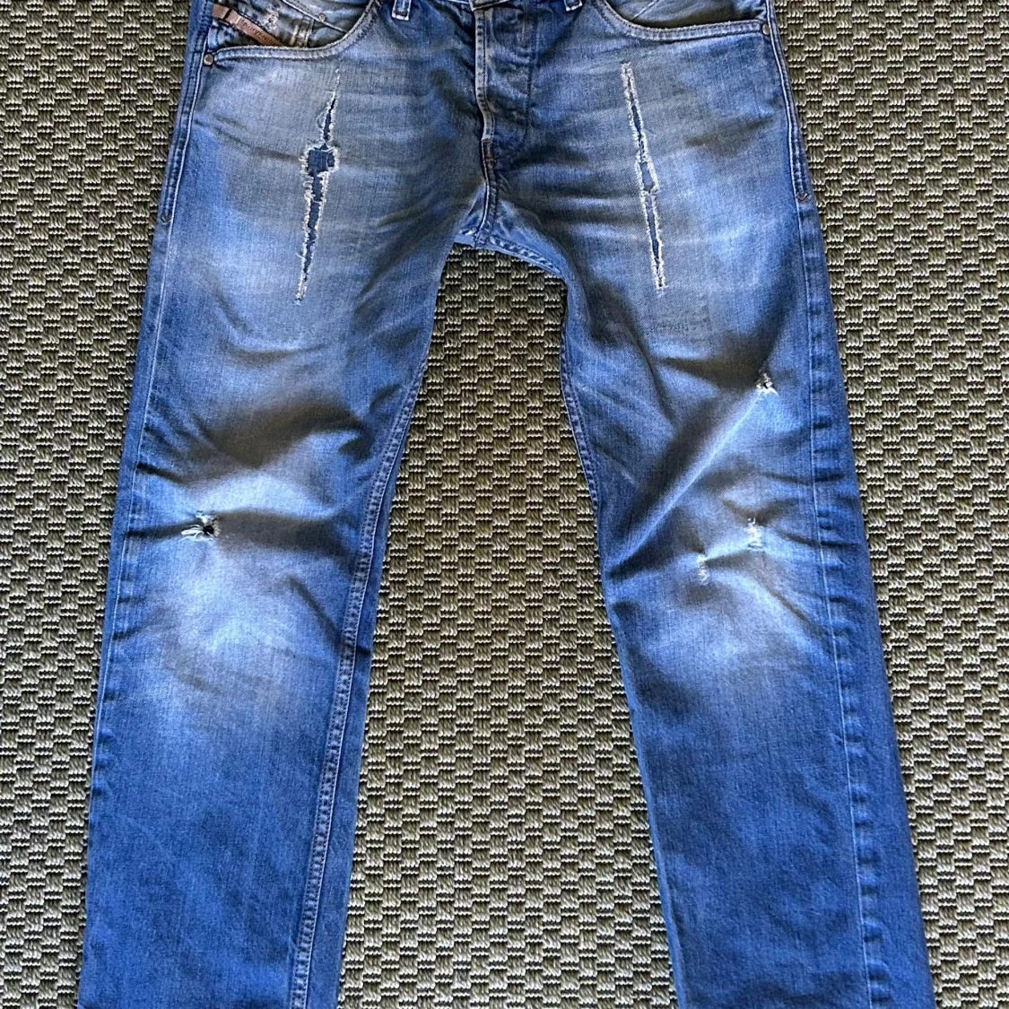 Säljer ett par blå Diesel Belther jeans med snygga slitningar och trasiga detaljer på benen. Jeansen har klassisk femficksdesign, normal passform och är tillverkade i jeansmaterial. Perfekta för dig som gillar en avslappnad och trendig look.