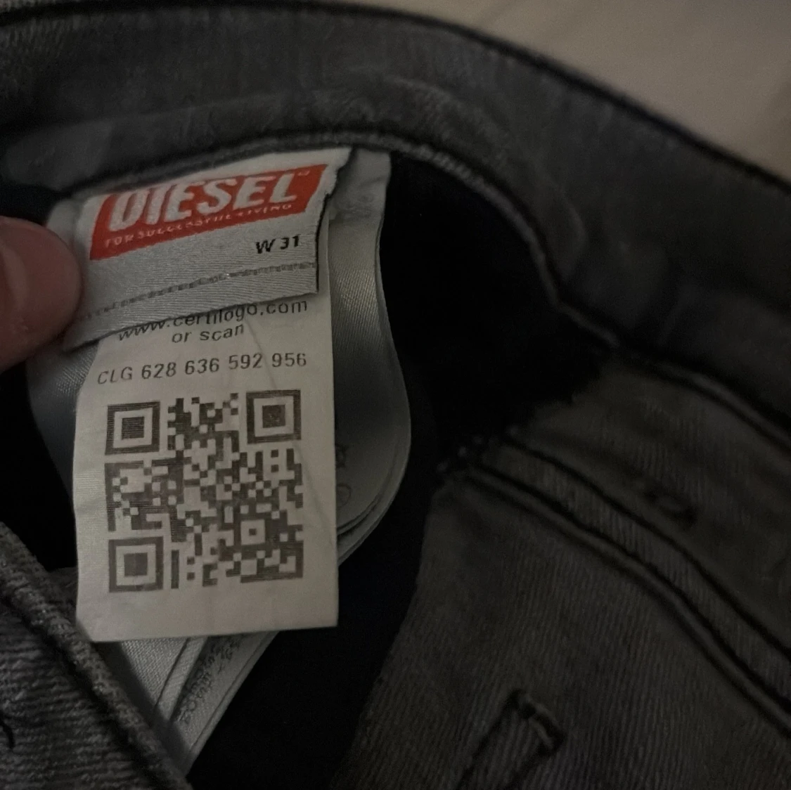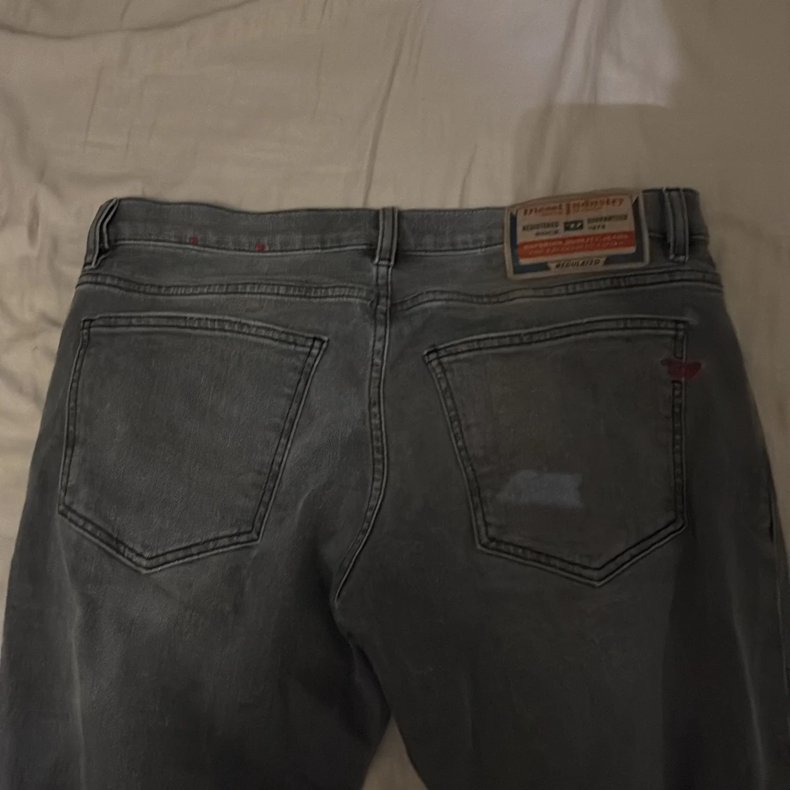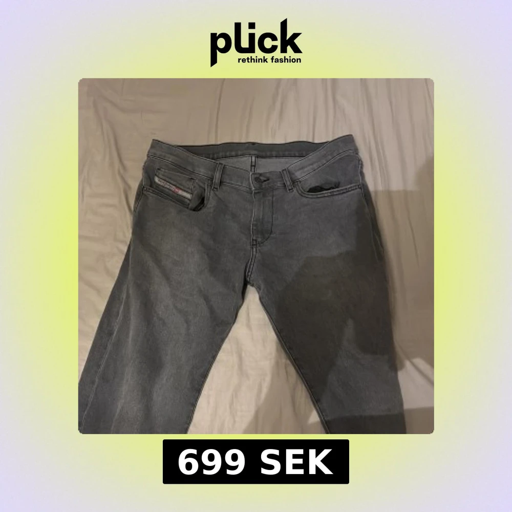 Snygga grå jeans från Diesel med klassisk femficksdesign och knappgylf. Perfekta för en avslappnad stil. Märkesdetaljer på bakfickan och etikett vid linningen.