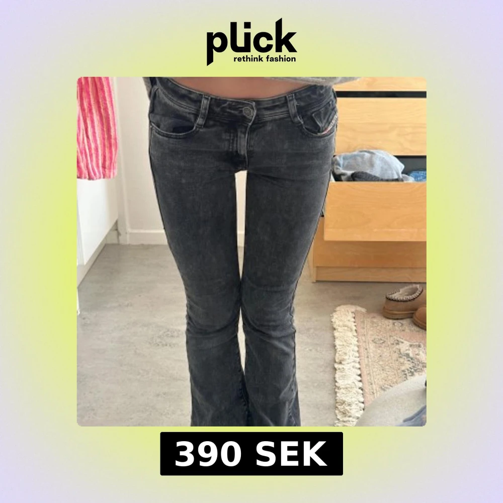 Säljer ett par svarta bootcut jeans från Diesel med klassisk femficksdesign och snygg tvättad look. Jeansen har låg midja och är tillverkade i mjukt denim-material. W25/L30