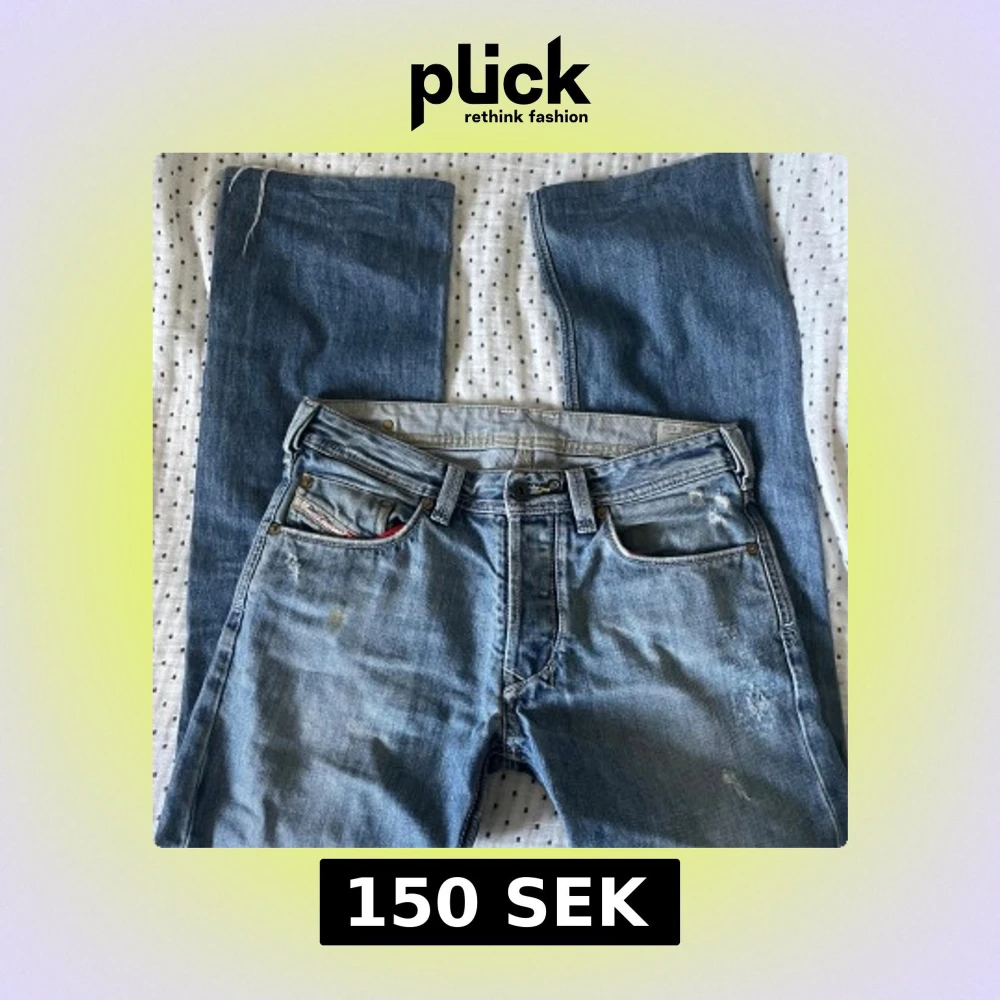 Jeans från disel, bra skick men en fläck som syns på sista bilden. Jag har sytt upp benen längst ned. Midjemått: 42 cm Innerbenslängd: 77 cm