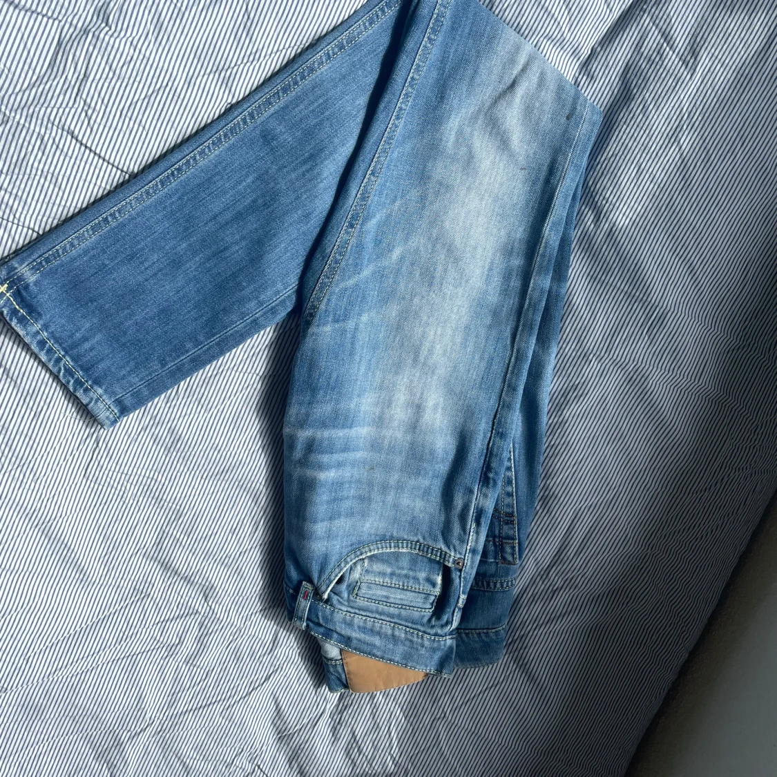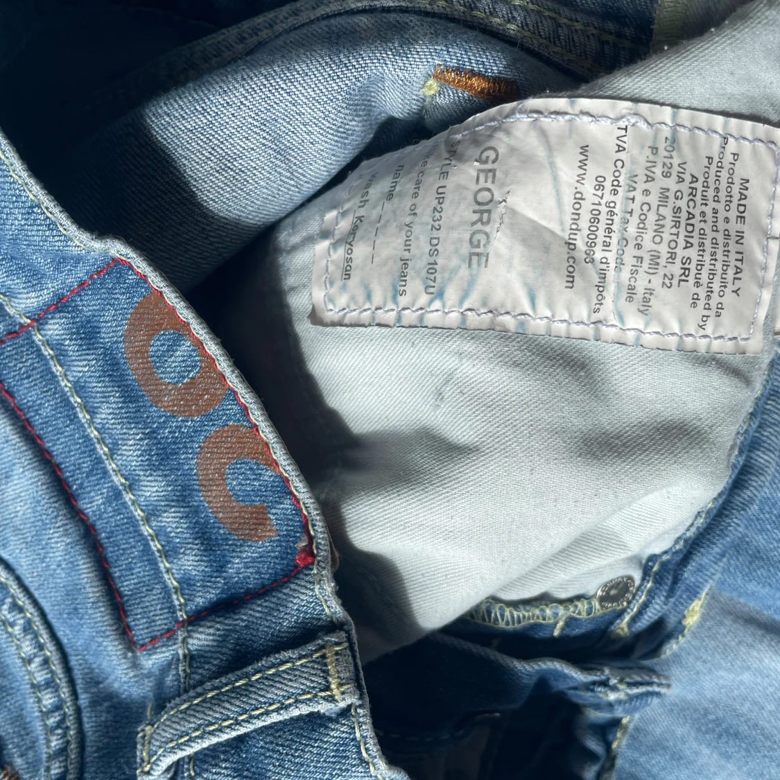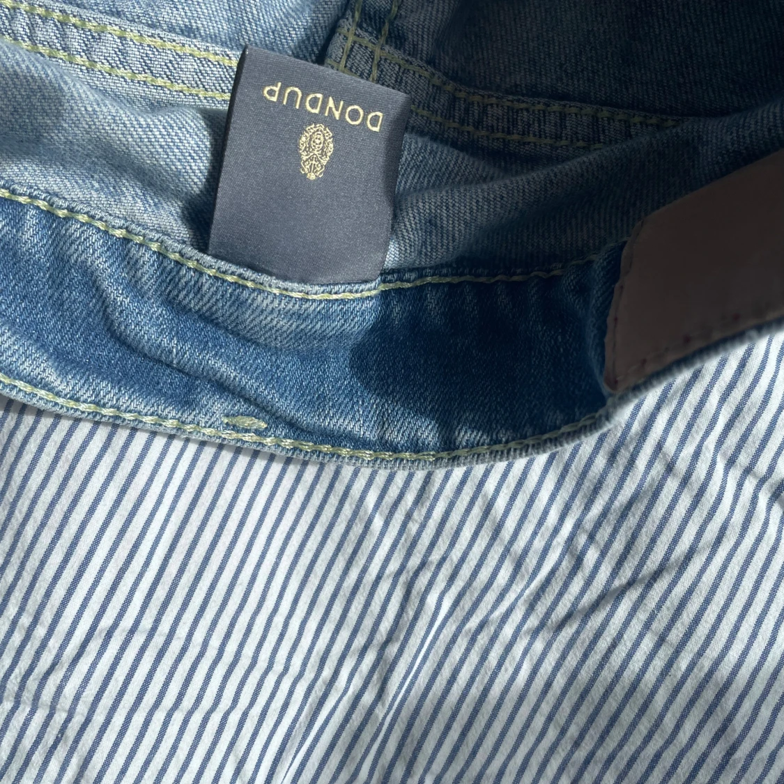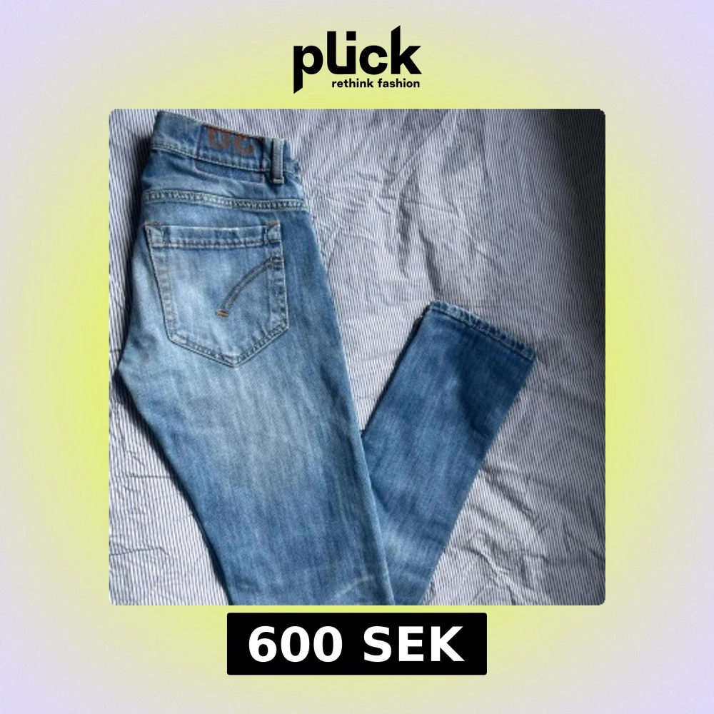 Säljer ett par snygga ljusblå jeans från Dondup, modell George. Jeansen har klassisk femficksdesign, raka ben och coola slitningar för en avslappnad vibe. Tillverkade i mjukt bomullsmaterial med diskreta kontrastsömmar och detaljer vid linningen.