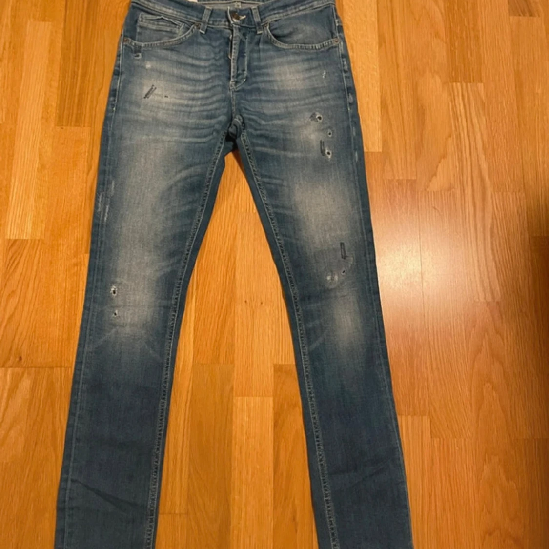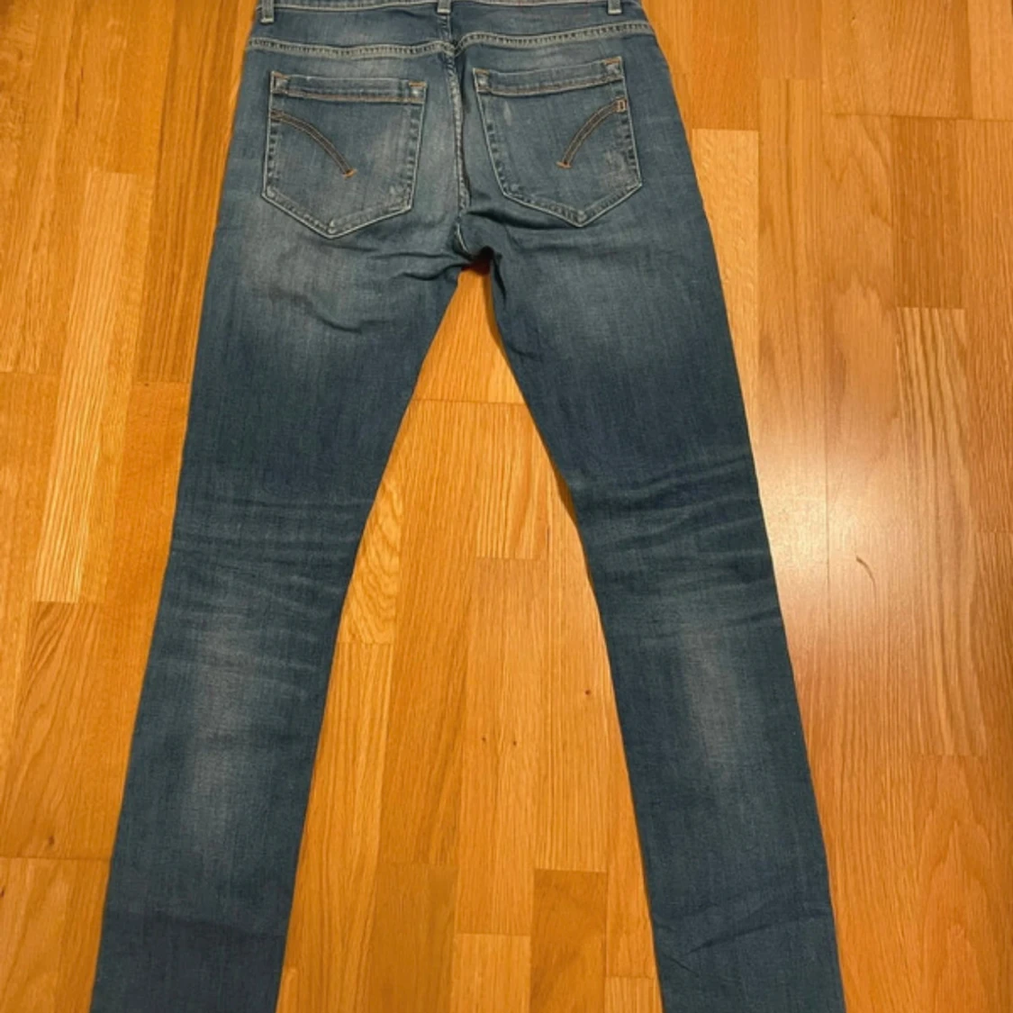 Snygga dondup jeans i blå tvätt med slitningar. Klassisk femficksmodell med orangea sömmar och detaljer. Jeansen har låg midja och är tillverkade i stretchig bomullsdenim för en bekväm passform.