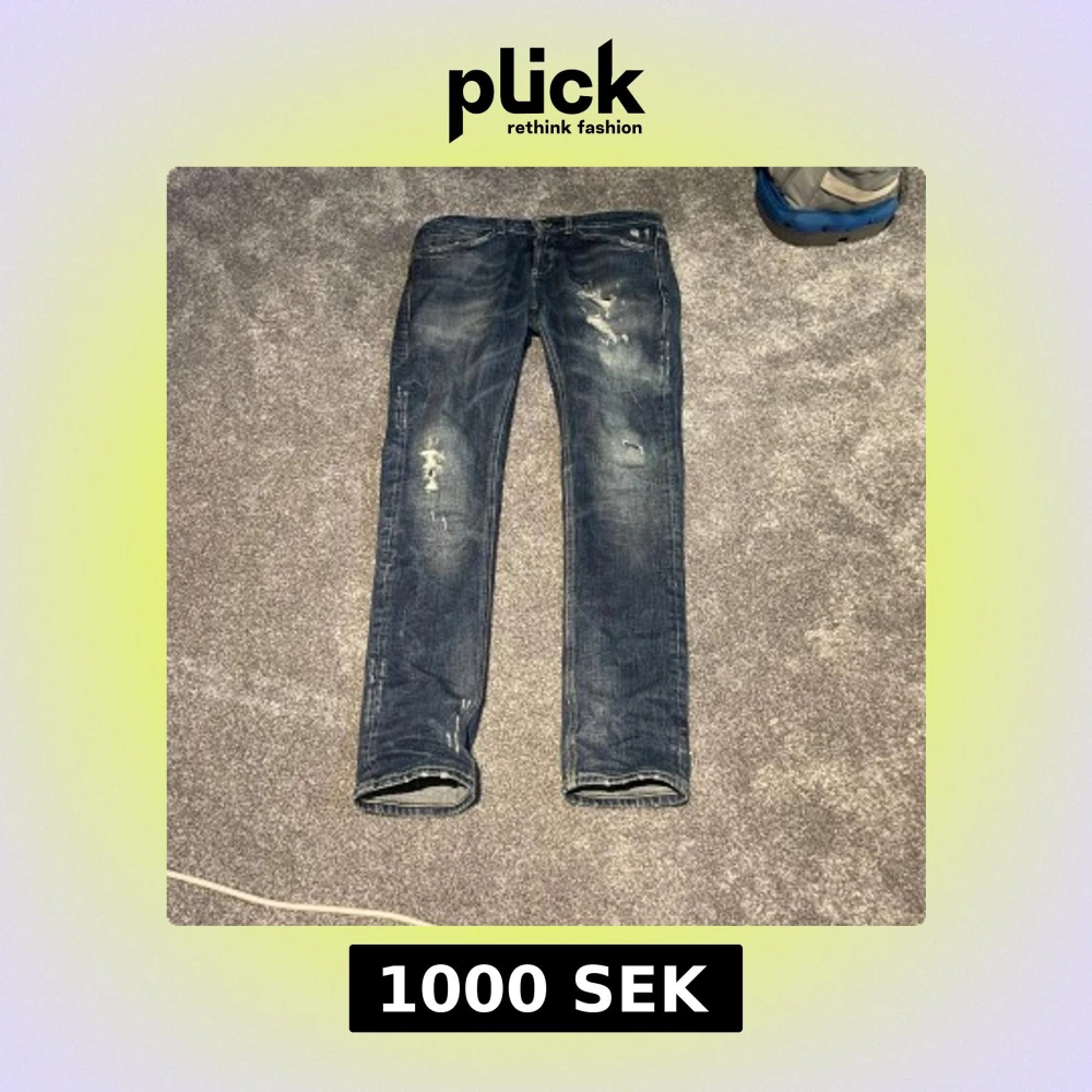 Säljer ett par blå jeans med coola slitningar och en vintage look. De har en klassisk femficksdesign och en bekväm passform. Perfekta för en avslappnad stil. Hör gärna av dig vid frågor eller så!