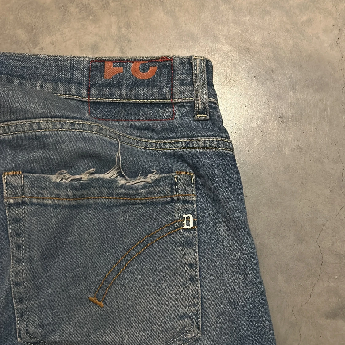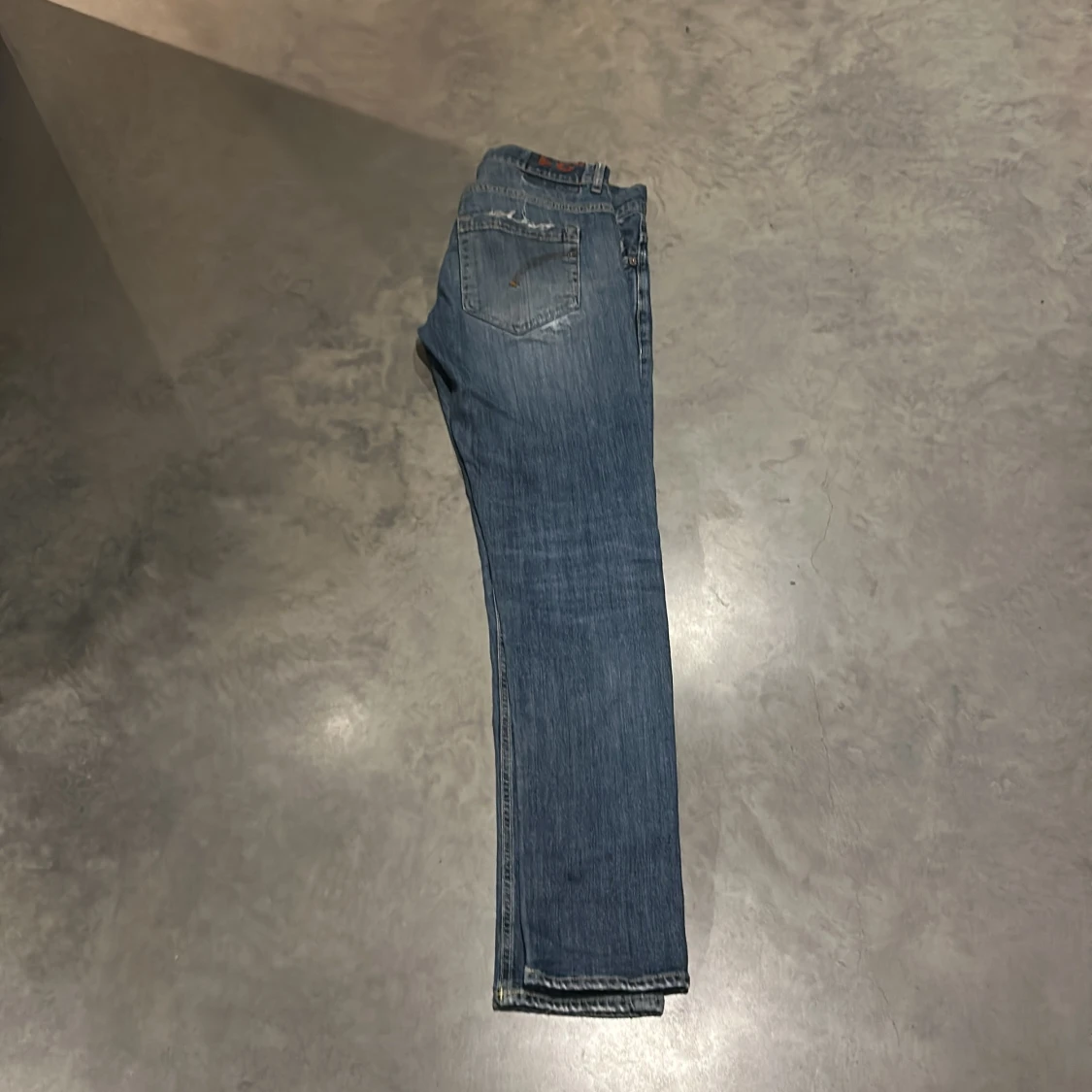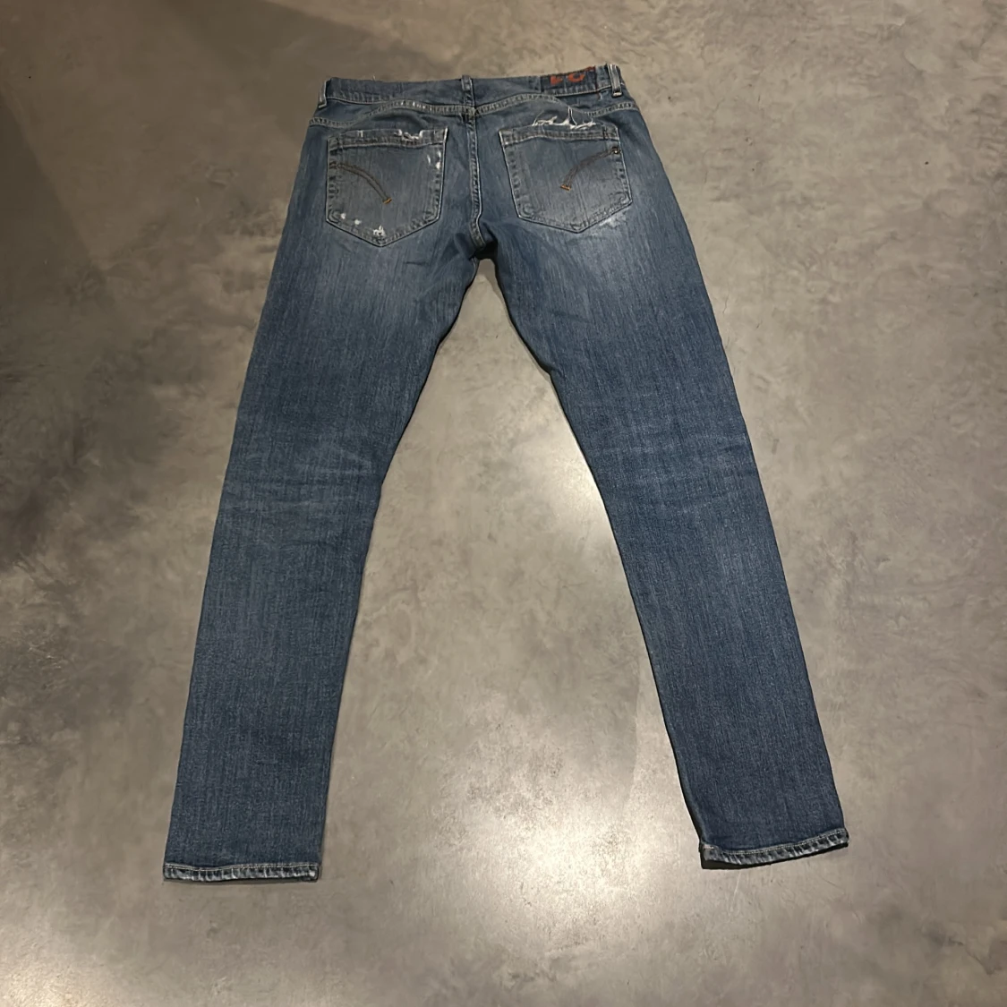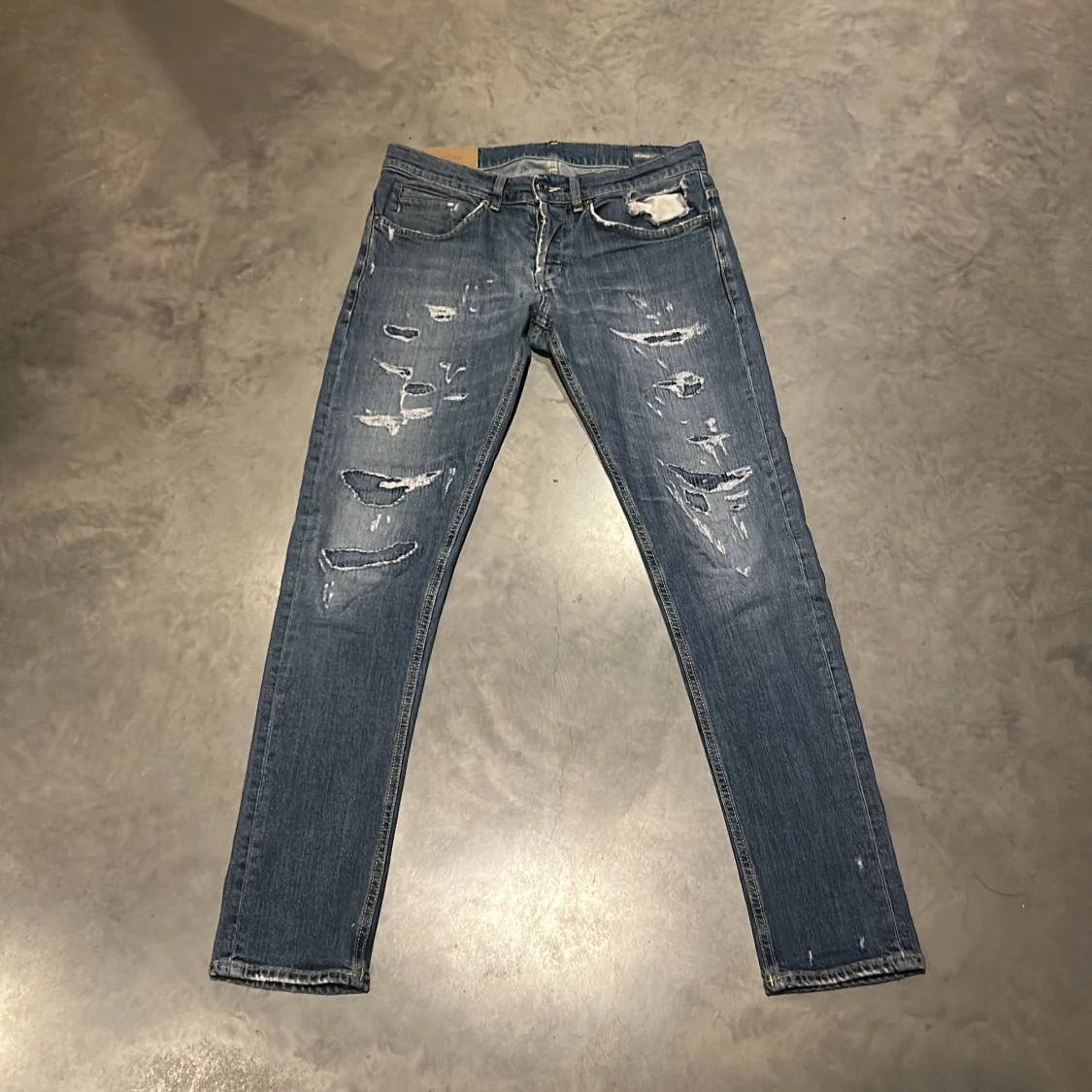 Säljer ett par blå jeans med slimfit passform och slitna detaljer framtill. Jeansen har klassisk femficksdesign, dragkedja och knapp i midjan.