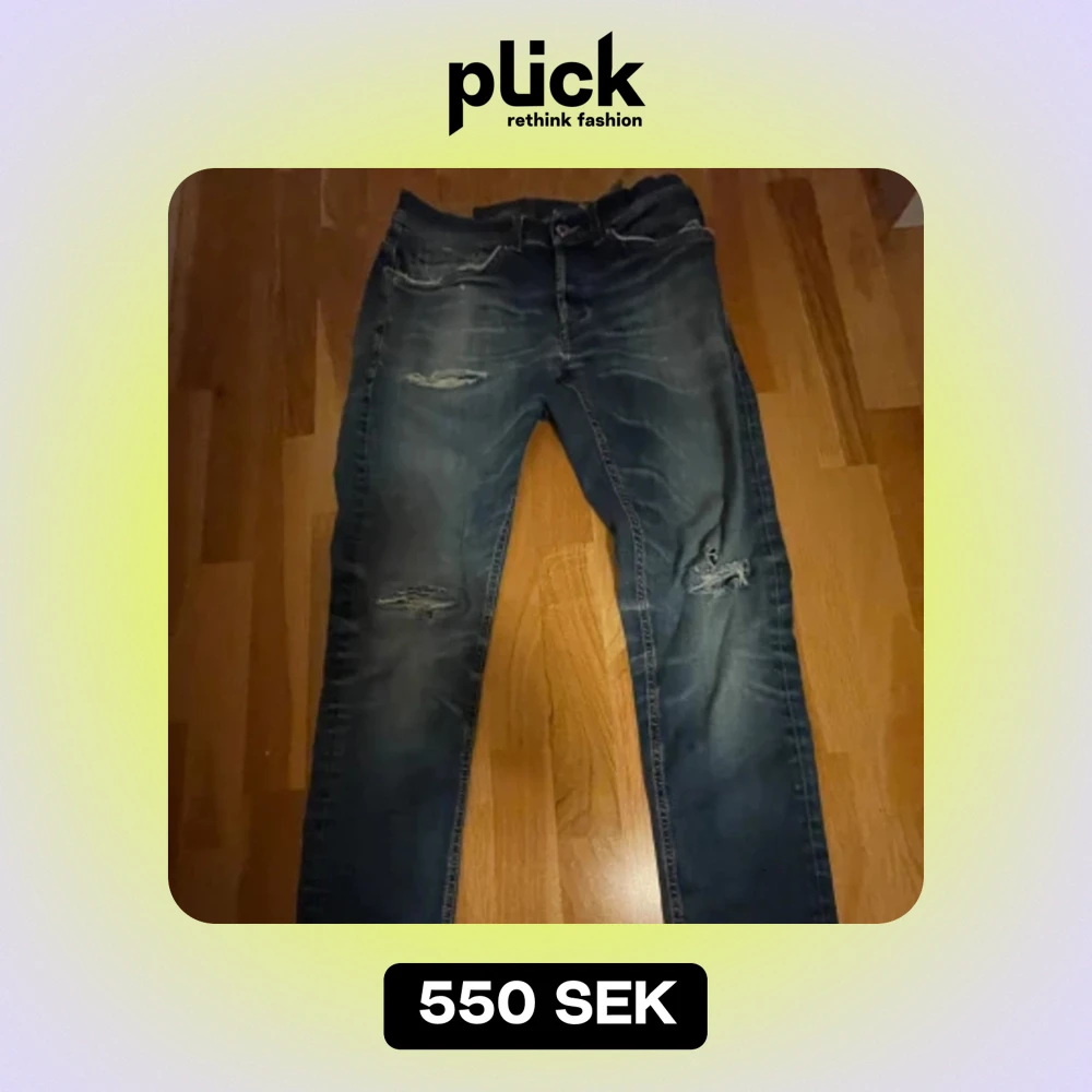 hej säljer ett par dondup jeans modellen georg slim. Jeansen är avklippta så passar dig som är runt 165-170. Hållen på knänna är fixade men inte så bra.