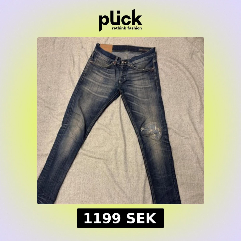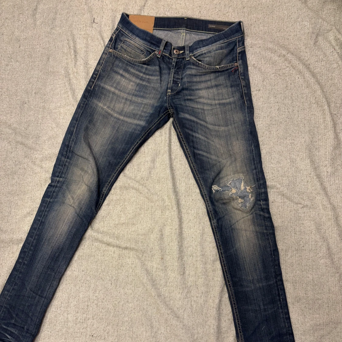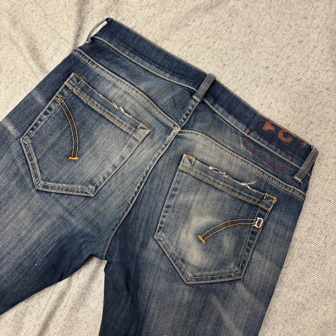 Snygga blå jeans från dondups med slitningar på knät och coola detaljer på bakfickorna. Jeansen har en klassisk femficksmodell, orangea sömmar och en något tvättad look. Perfekta för dig som gillar en avslappnad och trendig stil.