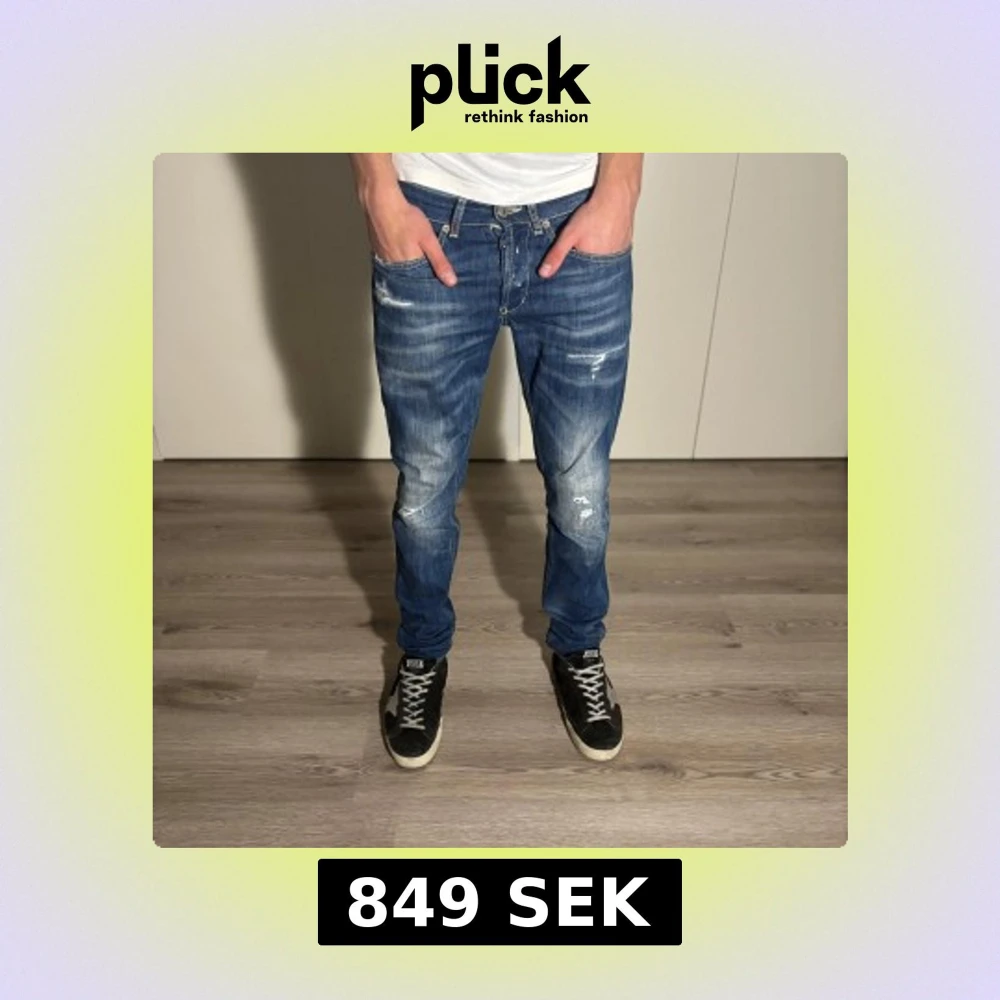Säljer ett par blå Dondup George med slitningar och lätt tvättad look. Byxorna är skinny fit. Perfekta för en avslappnad stil.