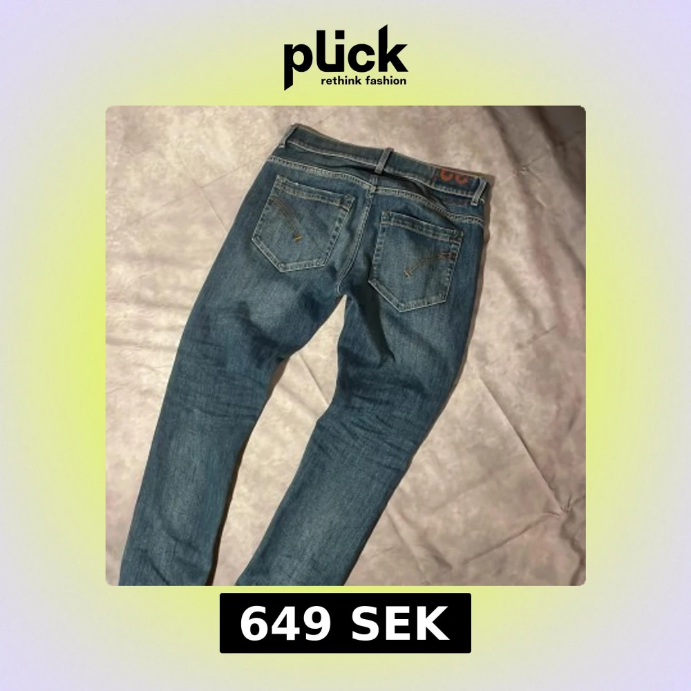 Snygga blå jeans från Dondup med klassisk femficksdesign och slitna detaljer på benen. Jeansen har en smal passform och är tillverkade i mjukt denimtyg som ger en skön känsla. Storlek 32 och skick 8/10. Ny pris runt 3000, mitt pris 649. Modell George sitter slim och passar perfekt om man är runt 165-175