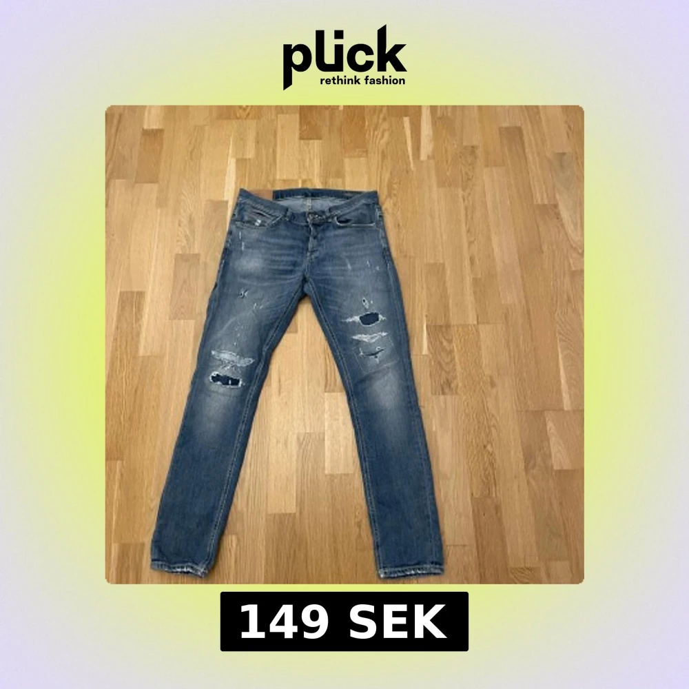 Tja! Säljer mina fina dondup George. Storlek 34 vilket ungefär är W31/ L32. Jeansen är superfina men har tyvärr gått sönder i skrevet, väldigt lättfixat dock. Det bläckliknande färgen på baksidan av fickan är en del av designen. Hör av dig vid minsta fråga eller fundering.