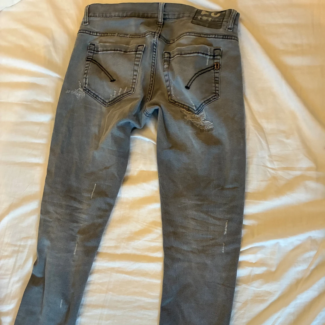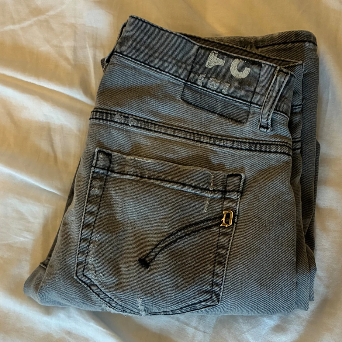 Grå skinny fit jeans från dondup i storlek 31. Jeansen har slitna detaljer och dragkedjor på bakfickorna för en cool look. Klassisk femficksmodell med låg midja och smal passform. Perfekta för dig som gillar en modern och avslappnad stil. Dem är modellen George