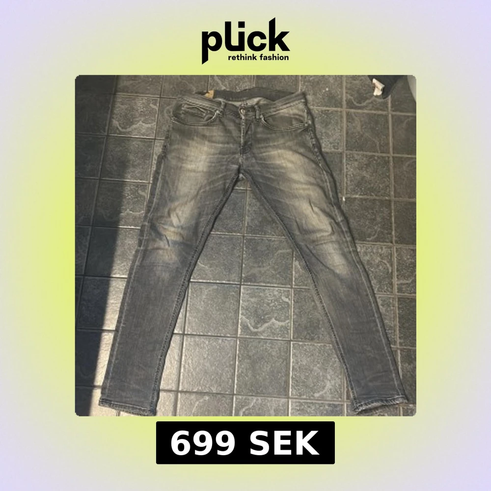 Snygga grå jeans från dondup i storlek 33 med slitna detaljer och klassisk femficksdesign. Jeansen har smal passform och diskret tvättad look, perfekta för en avslappnad stil. Materialet är mjukt och stretchigt jeans för extra komfort. Har gått sönder i skrevet men är lagat dem hos skräddare så vilket förebygger fler hål.
