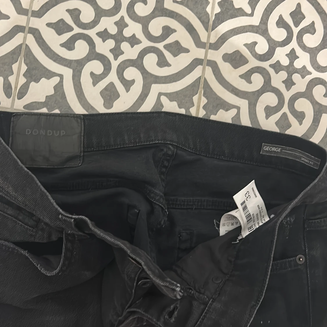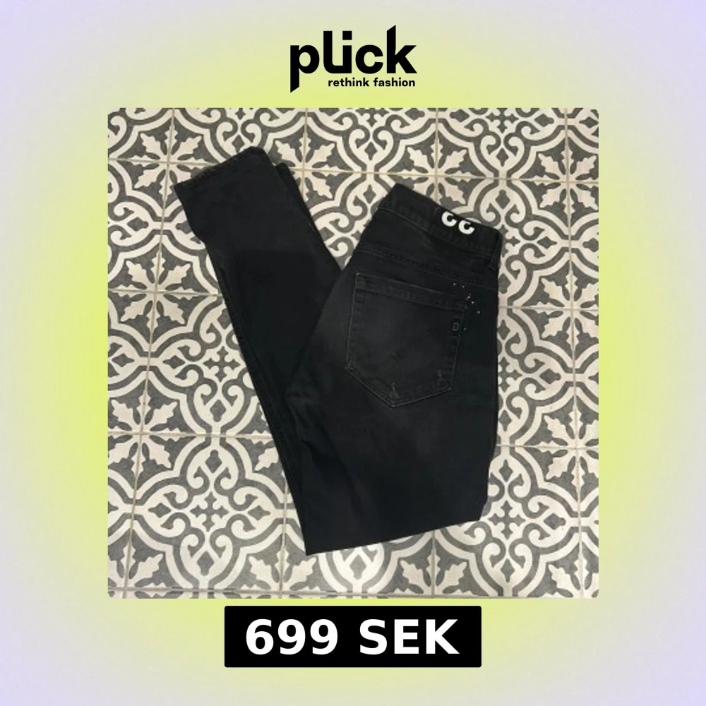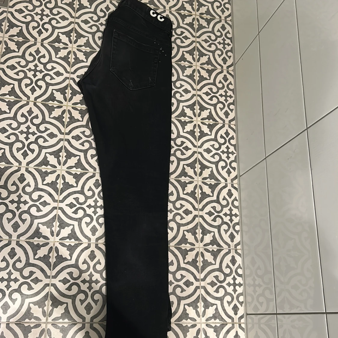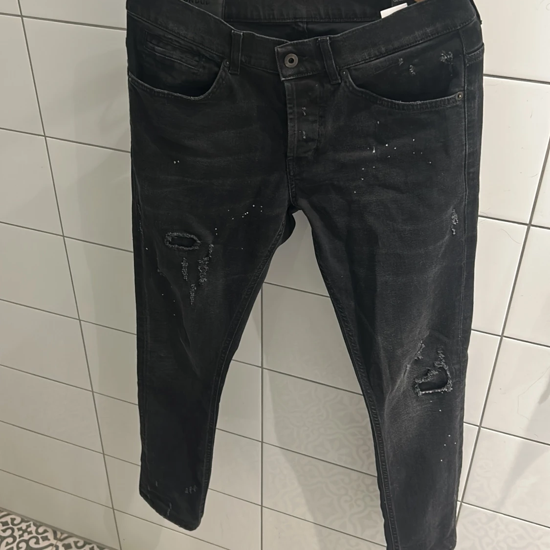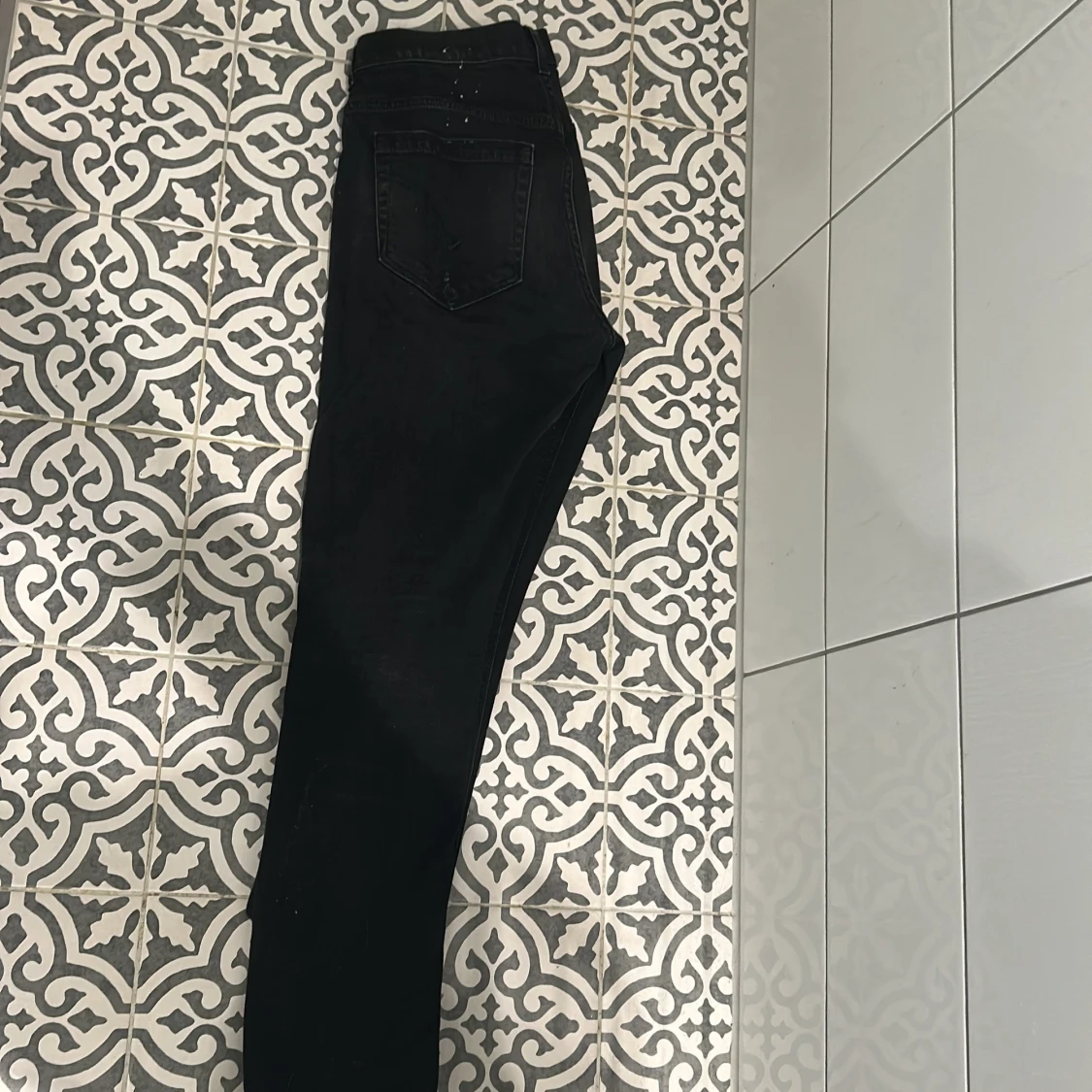 Svarta jeans med skinny fit och coola slitningar samt små vita färgstänk. Klassisk femficksmodell med dragkedja och knapp. Jeansen har en smal passform och är tillverkade i stretchigt jeansmaterial för en bekväm känsla. storlek 33, bara att höra av sig vid frågor och funderingar