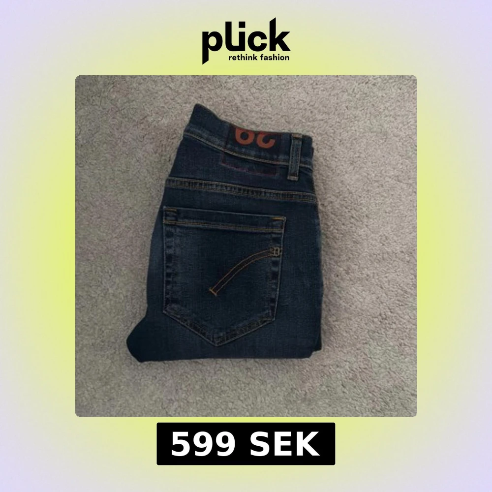Säljer ett par mörkblå jeans från Dondup med klassisk femficksdesign och snygga kontrastsömmar. Jeansen har normal passform och raka ben. Perfekta för dig som gillar stilrena och tidlösa jeans. Storlek 29, äkthetsbevis från Vestiaire.