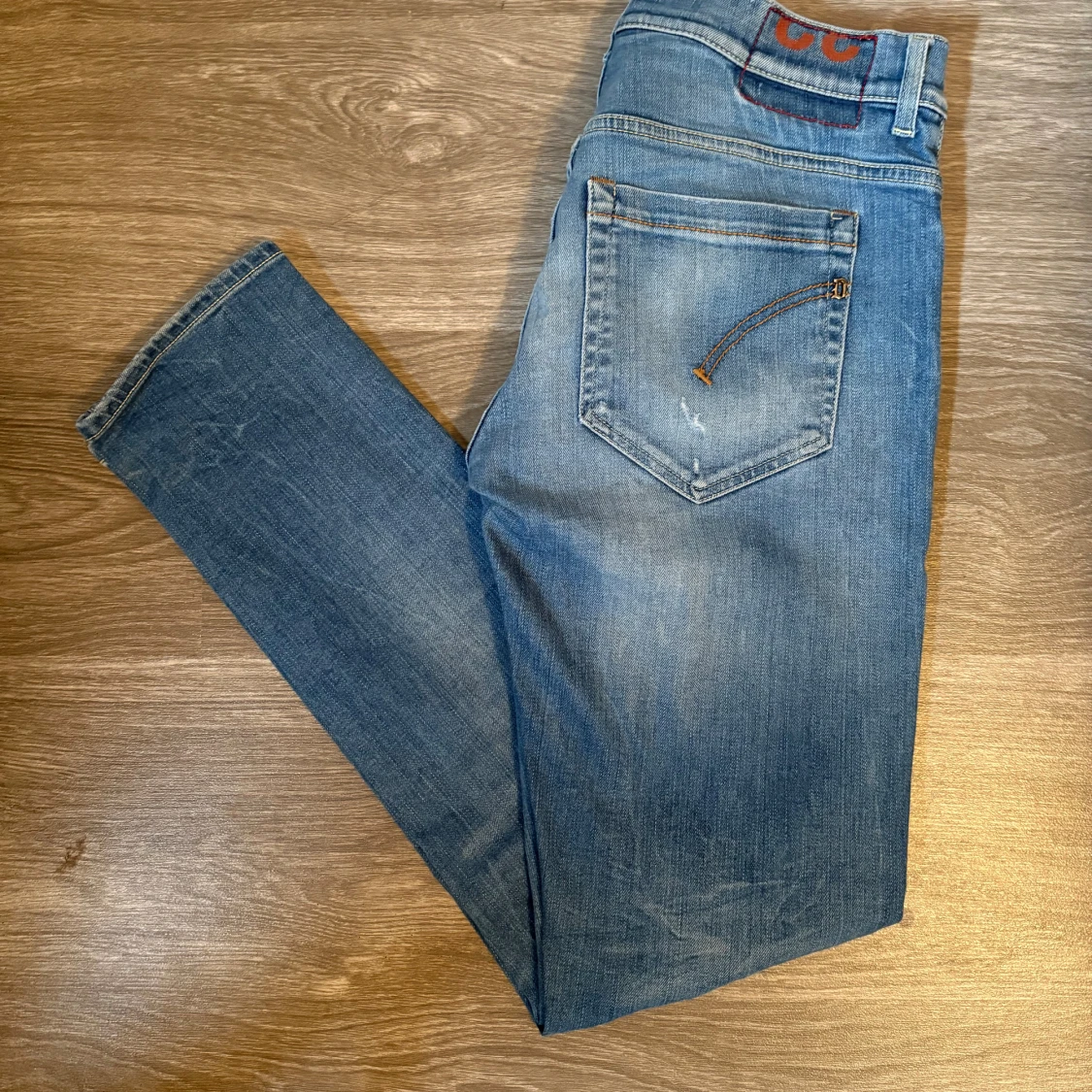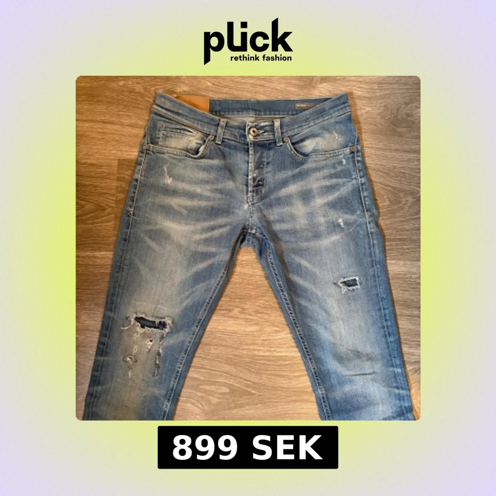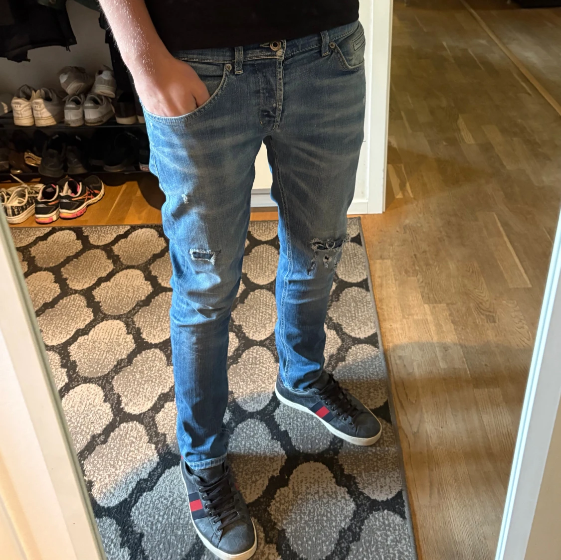 Hej! Säljer ett par tvär feta dondup jeans med slitningar ⭐️|| Skick : Bra || Storlek : W32 || Personen på bilden är 187cm och väger 76kg || Har du några frågor är det bara att höra av sig 😆⭐️