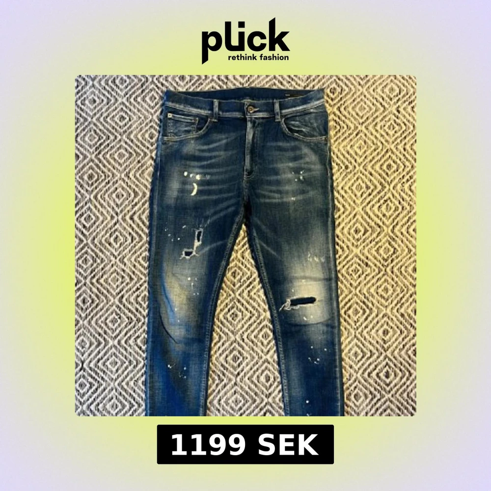 Riktigt snygga blå jeans från Dondup med slitna detaljer och färgstänk. säljer pga att de är för små. Knappt använda.
