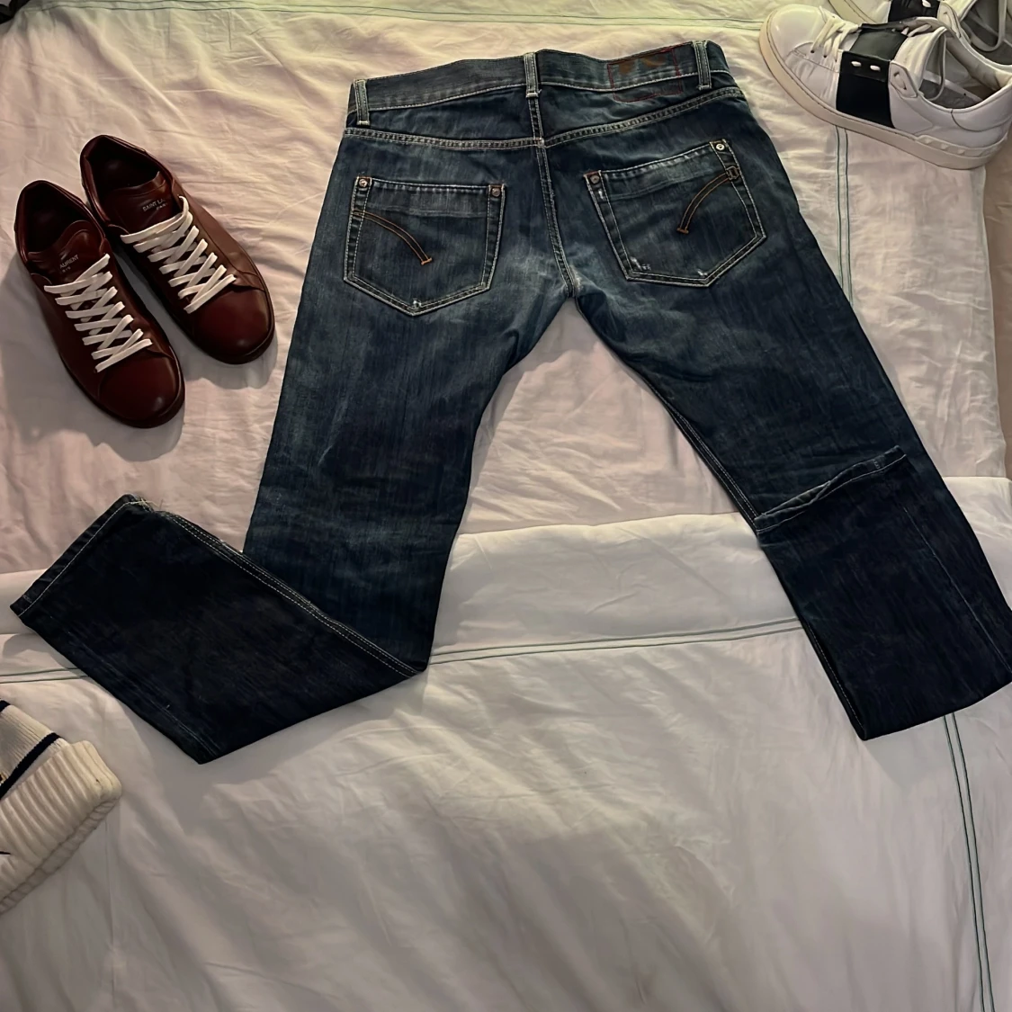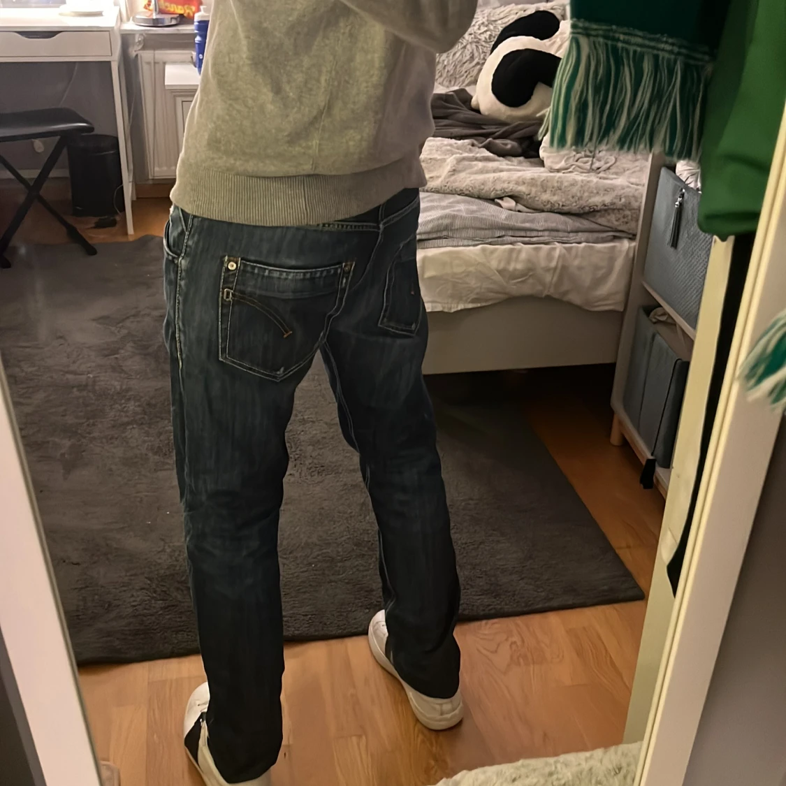 Snygga mörkblå jeans från Dondup med snygga slitningar. Jeansen har en knappstängning fram samt detaljerade bakfickor. Dem är i bra skick med en liten skada som är lagad, men smälter in i designen så det är inget man uppmärksammar. Modellen är ca. 185 cm och dem passar perfekt i längden. Ligger på ungefär 3000 kr nya. Har du fler frågor så svarar jag gärna. Jag tar gärna emot byten också.