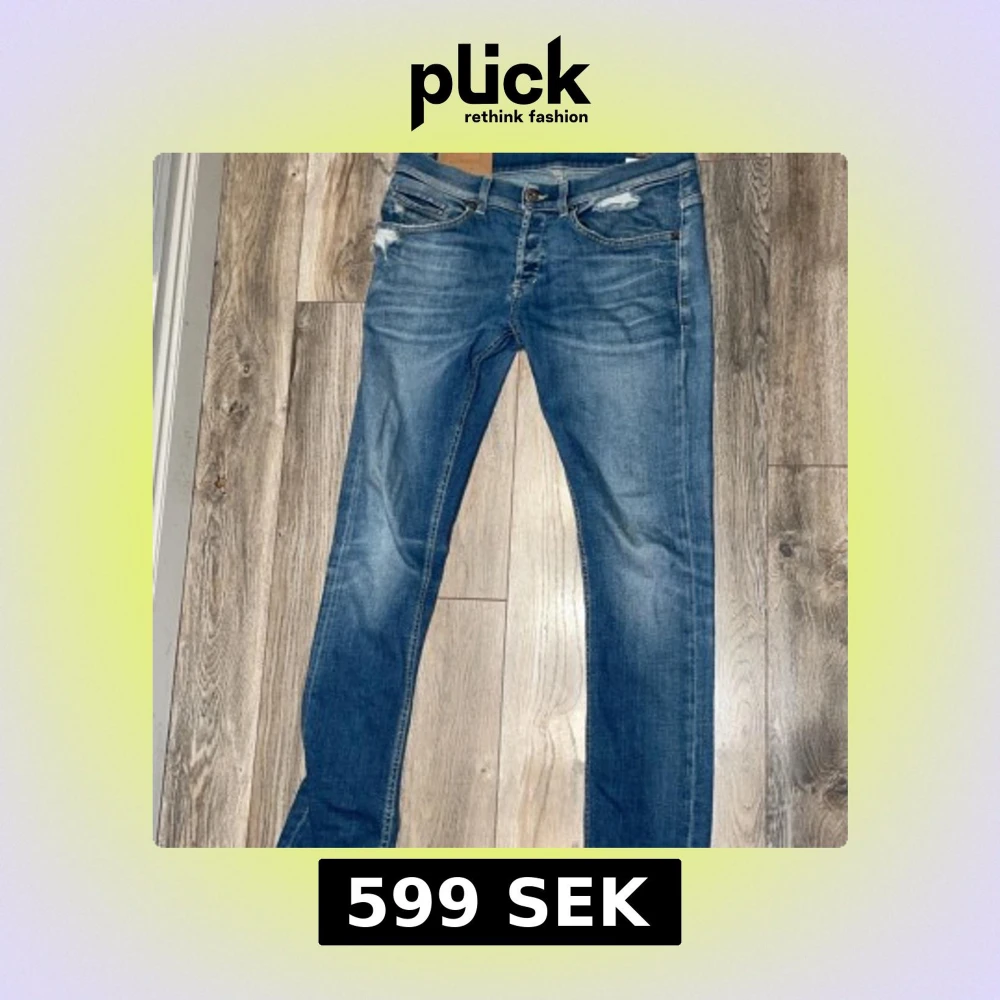 Säljer ett par blå jeans från dondup riktigt populära bland dem unga väldigt stilrena jeans W30 nypris:3000 priset ej hugget i sten kom med budd