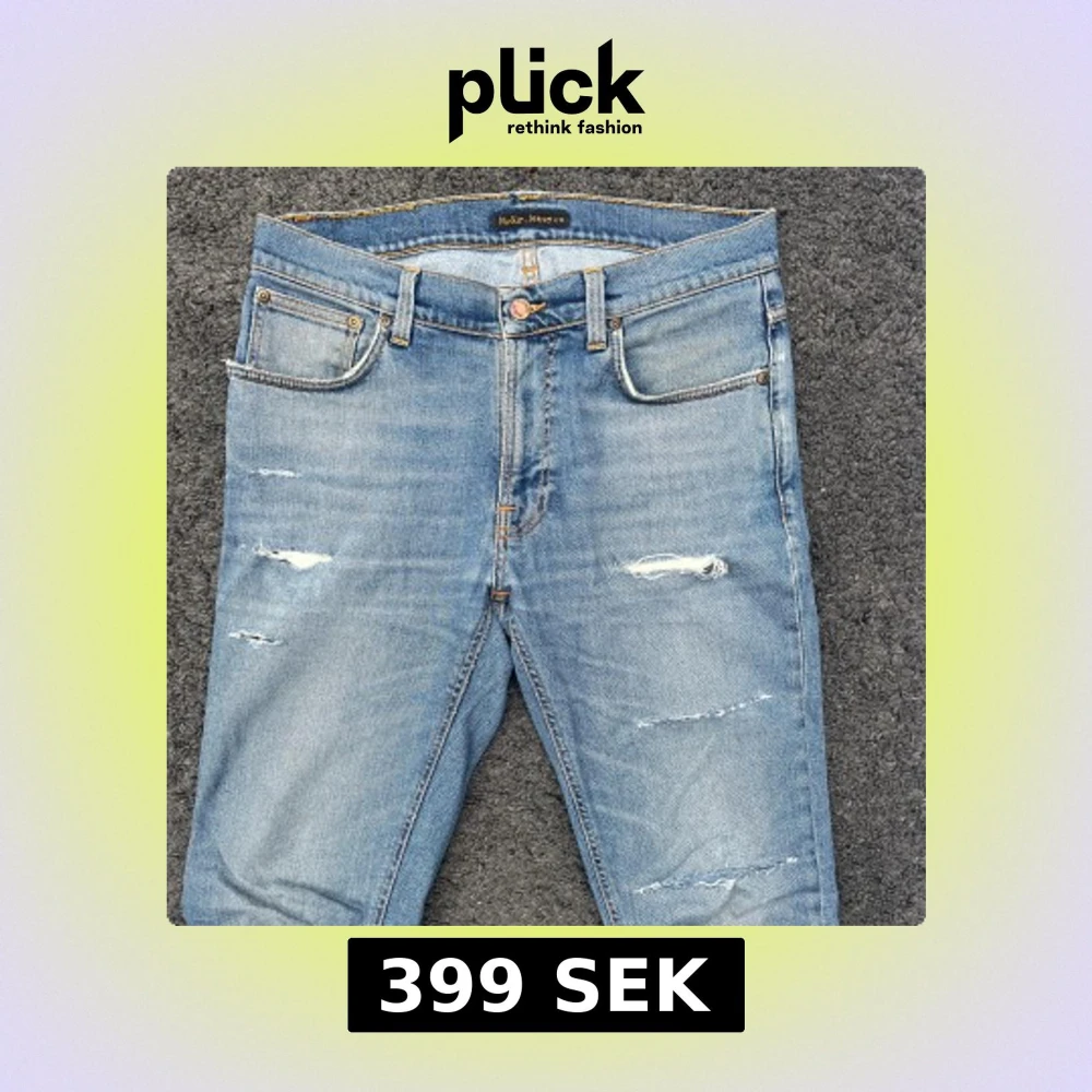 Säljer ett par blåa slim jeans från Nudie med slitningar. Om det är någon slitning man inte gillar går det att ta bort helt gratis i en nudie butik. Jeansen är riktigt sköna - tillverkade i fin bomull. Perfekt för en stilig look. W32 L34. Tveka inte på att höra av dig vid minsta tanke eller fundering! 😁