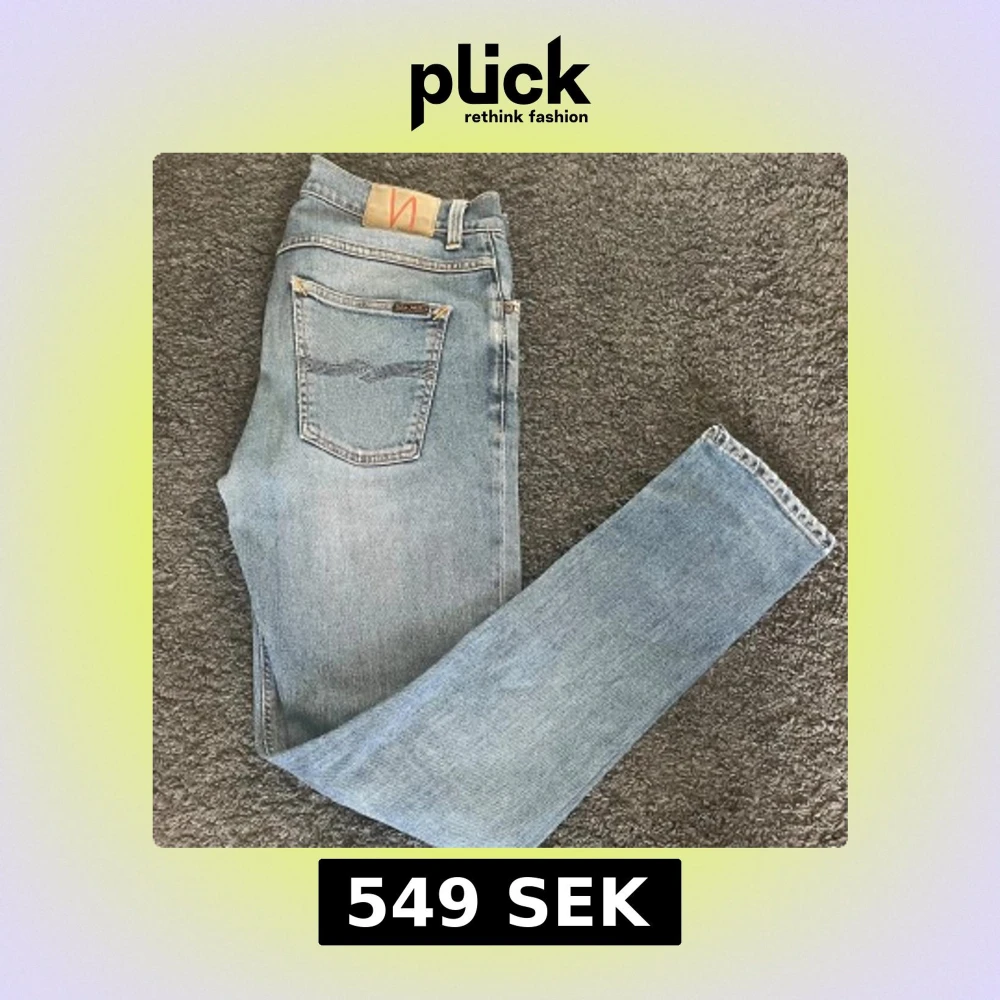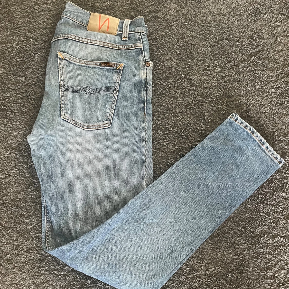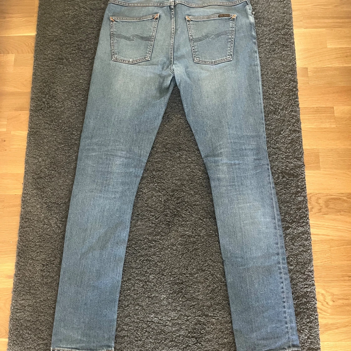Säljer ett par blåa slim jeans från Nudie med slitningar. Slitningarna är customized. Går att ta bort de som man inte vill ha dem helt gratis i en nudie butik. Jeansen är riktigt sköna - tillverkade i fin bomull. Perfekt för en stilig look. Tveka inte på att höra av dig vid minsta tanke eller fundering! 😁
