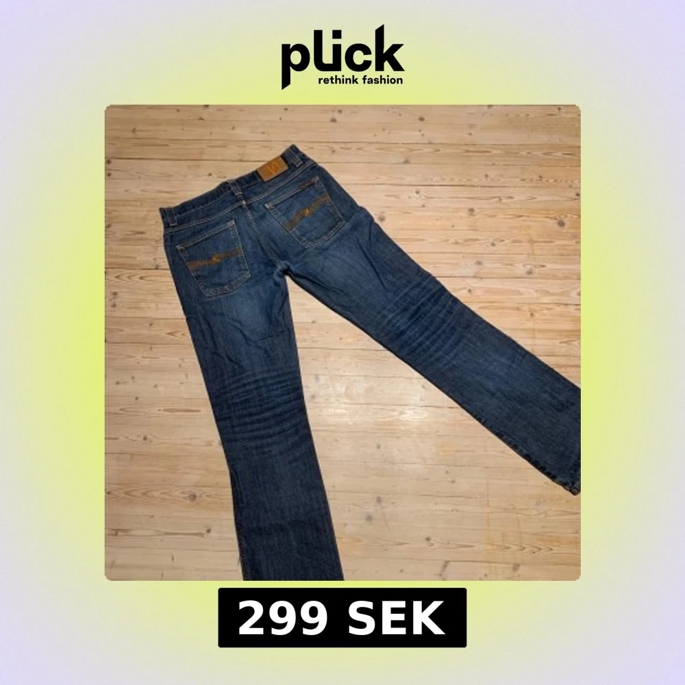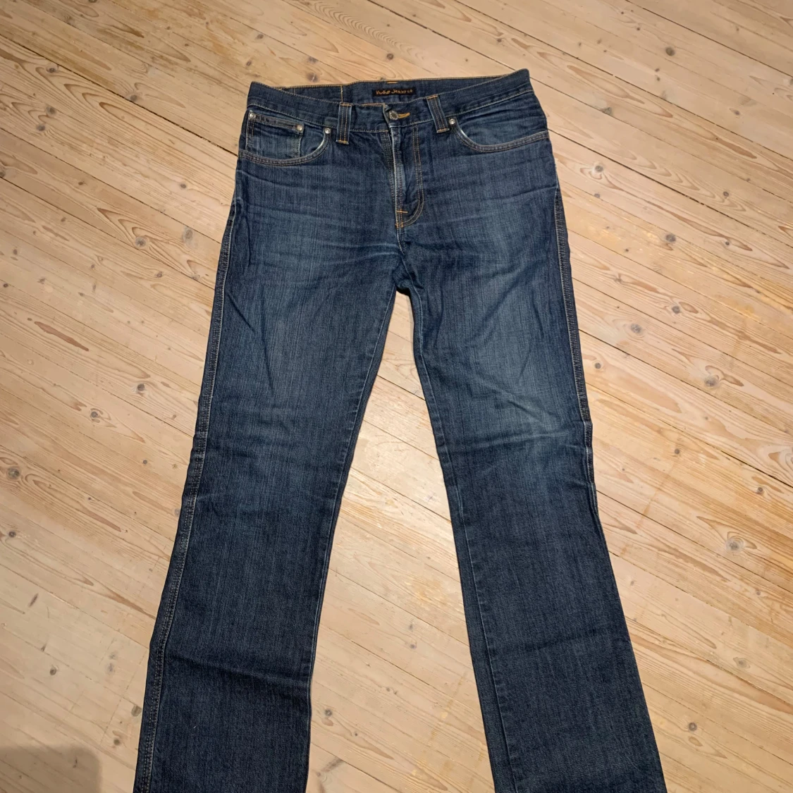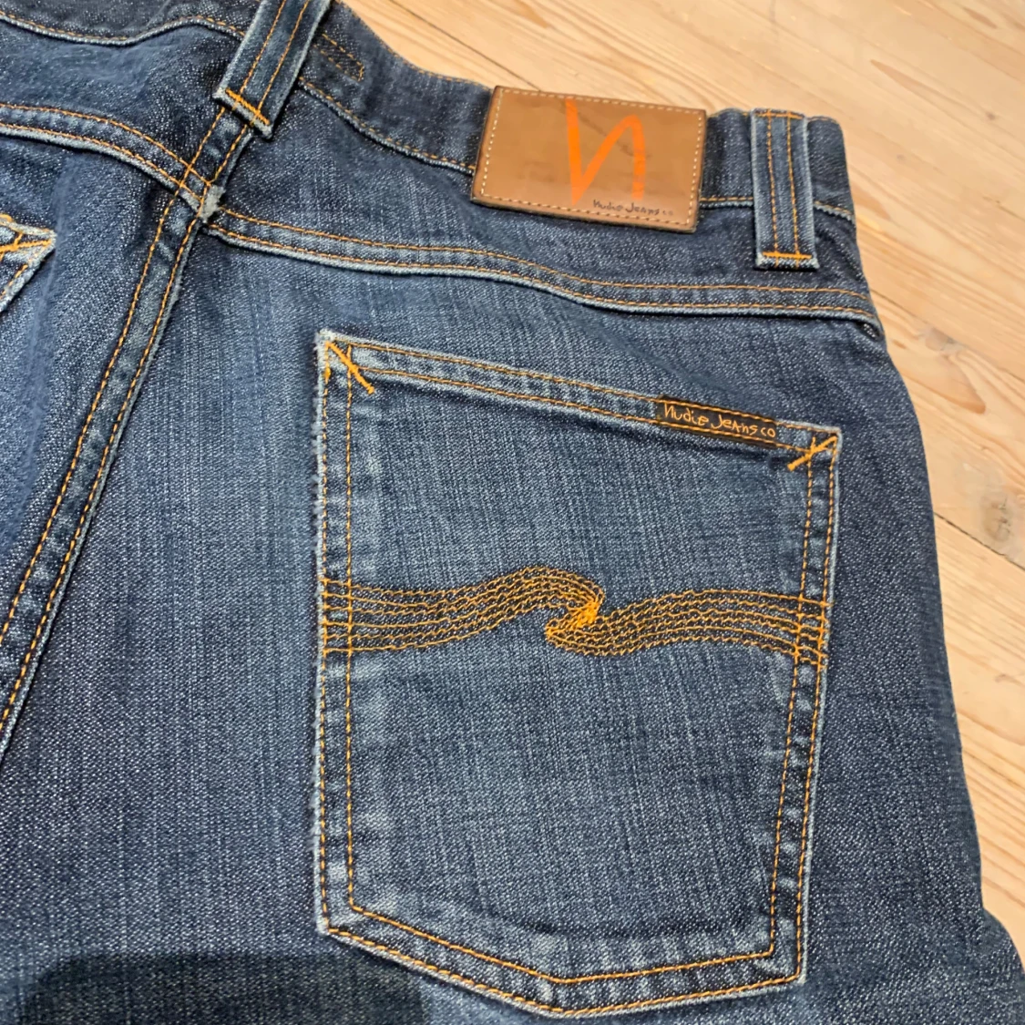 Säljer ett par klassiska blå jeans från Nudie Jeans med snygga orange sömmar och broderad bakficka. Modellen har normal passform och raka ben. Perfekta för dig som gillar stilrena och tidlösa jeans. Storlek W32L34