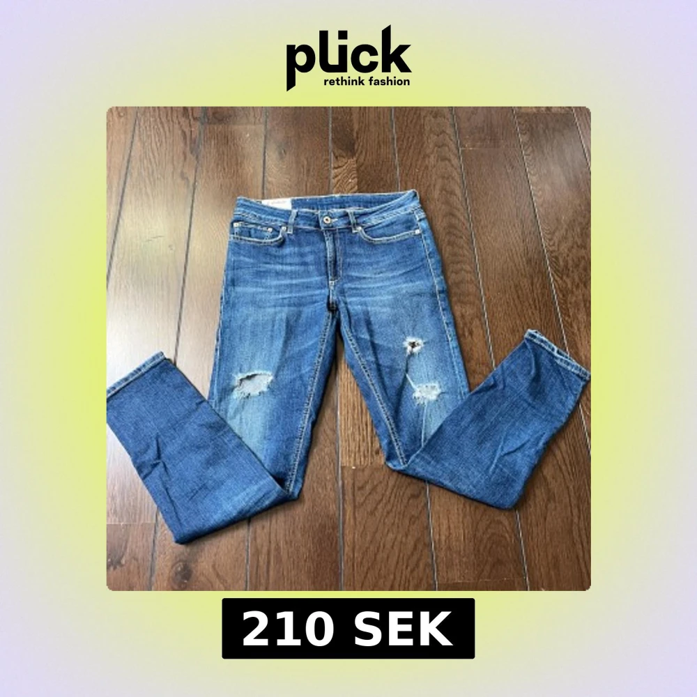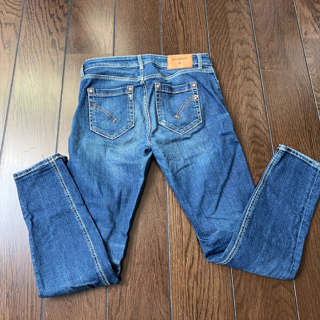 Snygga blå jeans från Dondup med slitna detaljer och hål på låren. Klassisk femficksmodell med orange sömmar och läderpatch bak i midjan. Jeansen har en smal passform och är tillverkade i stretchigt jeansmaterial för extra komfort.