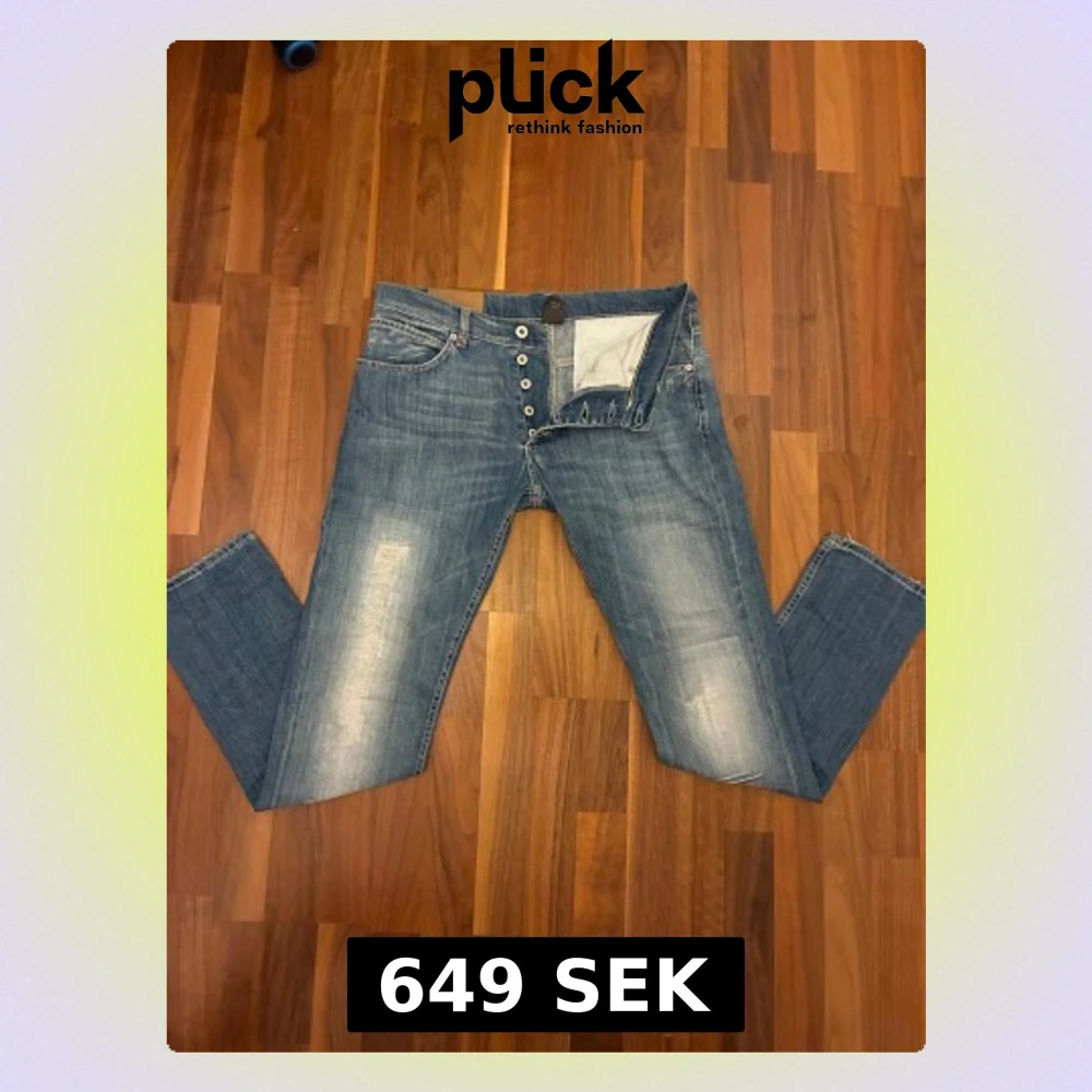Säljer ett par Dondup jeans i ljusblå tvätt med snygga slitningar och knappar framtill. Jeansen har tapered passform, klassiska fem fickor och cool detalj med broderad bakficka. Perfekt för dig som gillar street och avslappnad stil