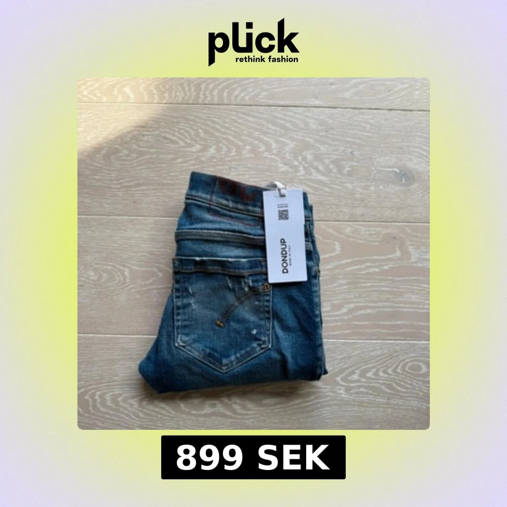 Säljer ett par blå jeans från Dondup med coola slitningar och hål på benen. Jeansen har klassisk femficksdesign, normal passform och är tillverkade i jeansmaterial. Perfekta för dig som gillar en avslappnad och trendig stil.