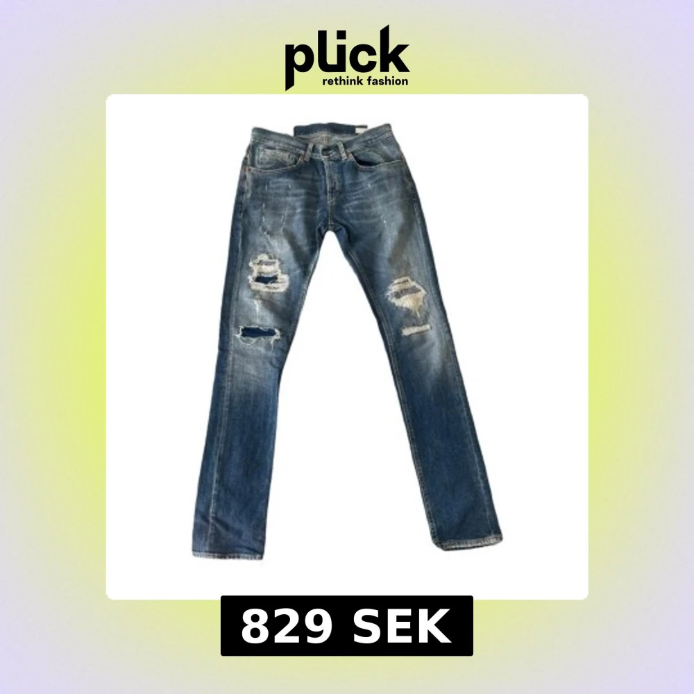Snygga blå jeans från Dondup, modell George Skinny Fit. De har slitna detaljer och stora hål på båda benen för en cool, edgy look. Klassisk femficksdesign, knappgylf och tillverkade i jeansmaterial med inslag av bomull och polyester. Mycket bra skick