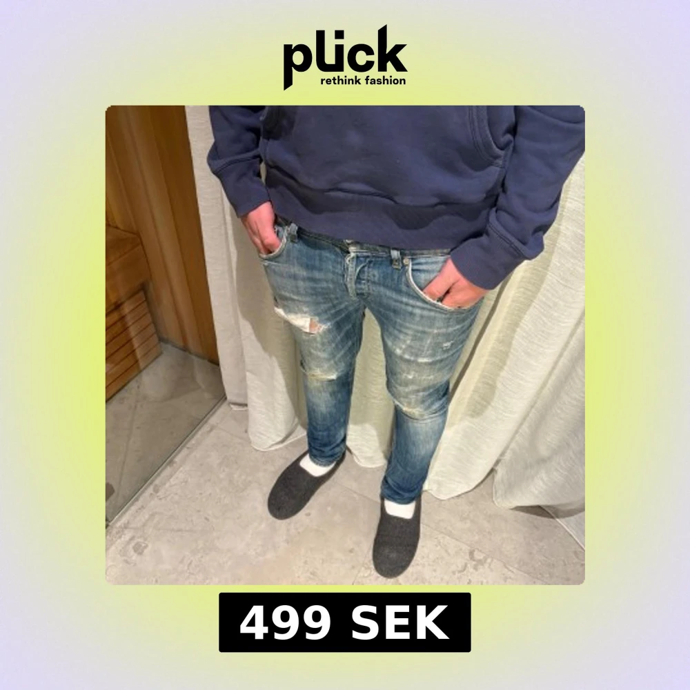Säljer ett par blå jeans med skinny passform och coola slitningar samt trasiga detaljer både fram och bak. Jeansen har klassisk femficksdesign och är tillverkade i jeansmaterial med en tvättad look. Perfekt för dig som gillar en edgy stil.