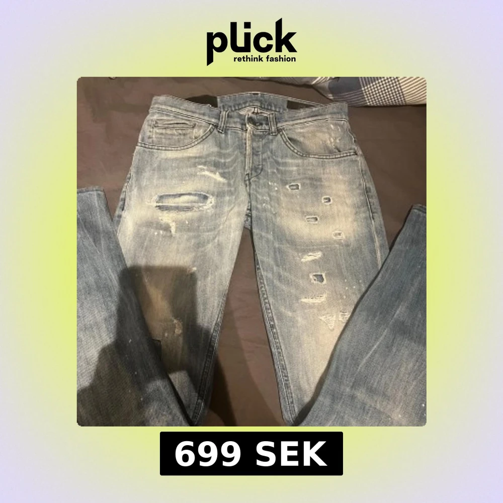 Säljer ett par blå jeans från Dondup med coola slitningar och distressed detaljer. De har en klassisk femficksdesign och knappgylf. Perfekta för en avslappnad stil.