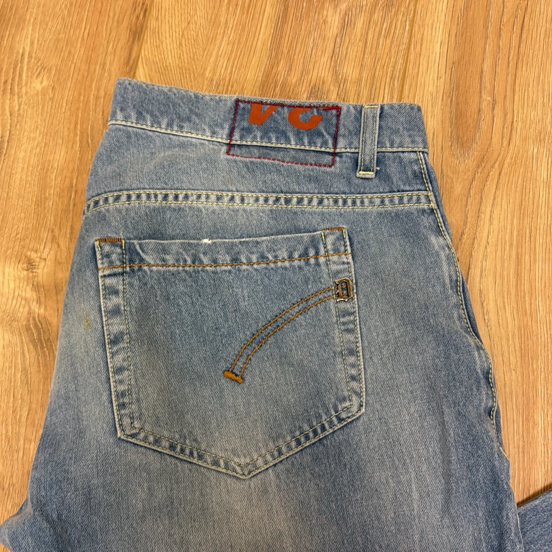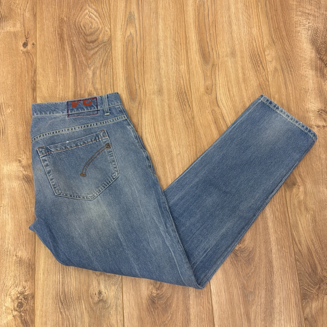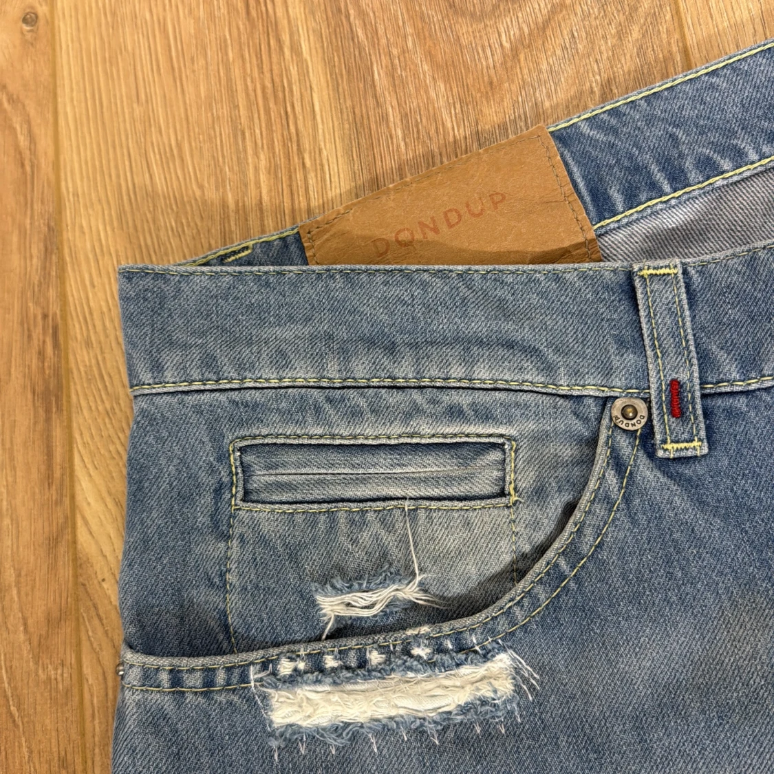 Snygga blå jeans från Dondup med slitningar och distressed detaljer framtill. Klassisk femficksmodell med ljus tvätt och raka ben. Jeansen har en läderpatch med Dondup-logga i midjan och coola kontrastsömmar. Perfekta för en avslappnad streetstil.