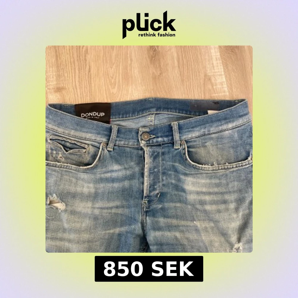 Säljer ett par blå jeans från Dondup med slitningar och hål på benen för en cool, avslappnad look. Jeansen är av modellen George och jag har själv sytt på det vita tyget under slitningarna på knät