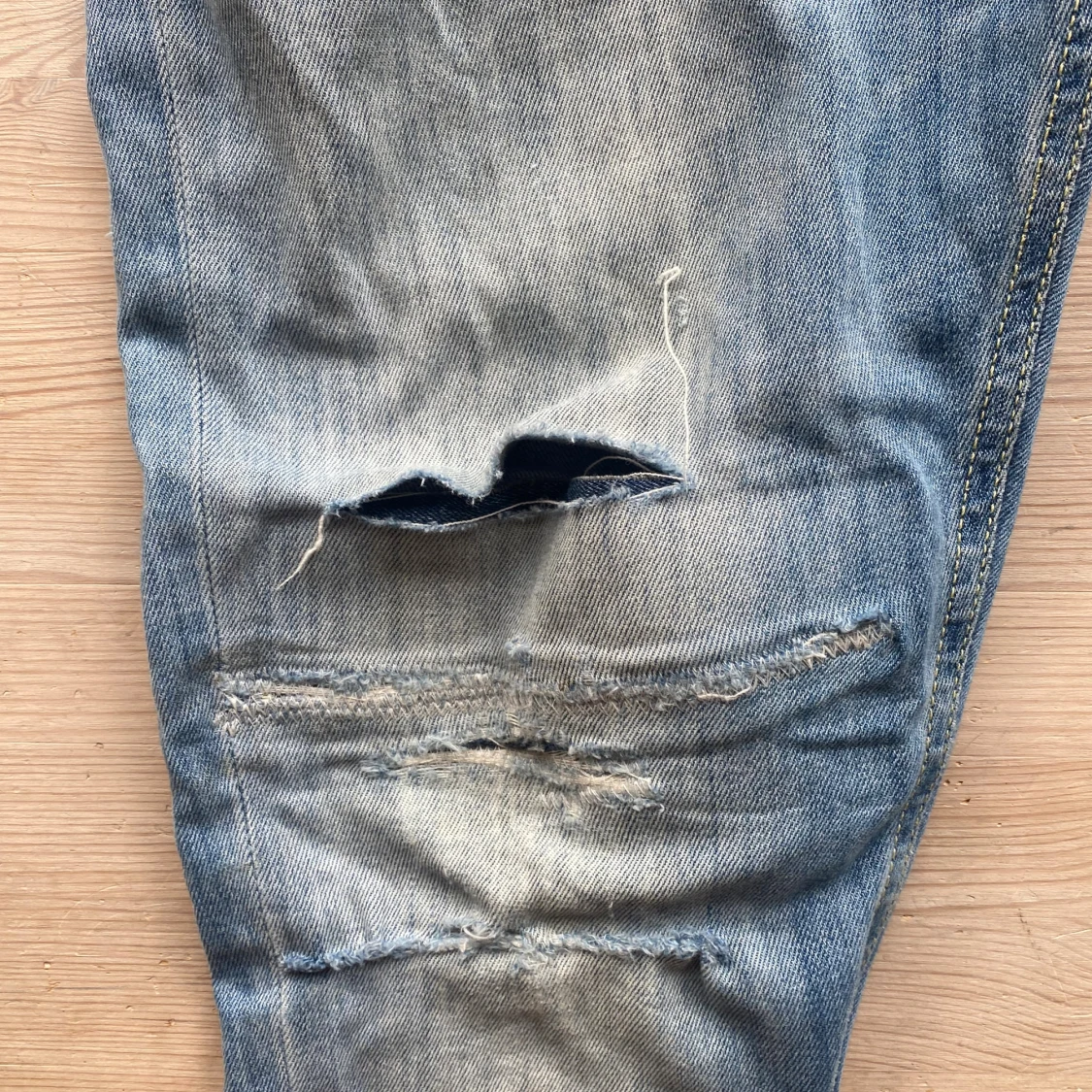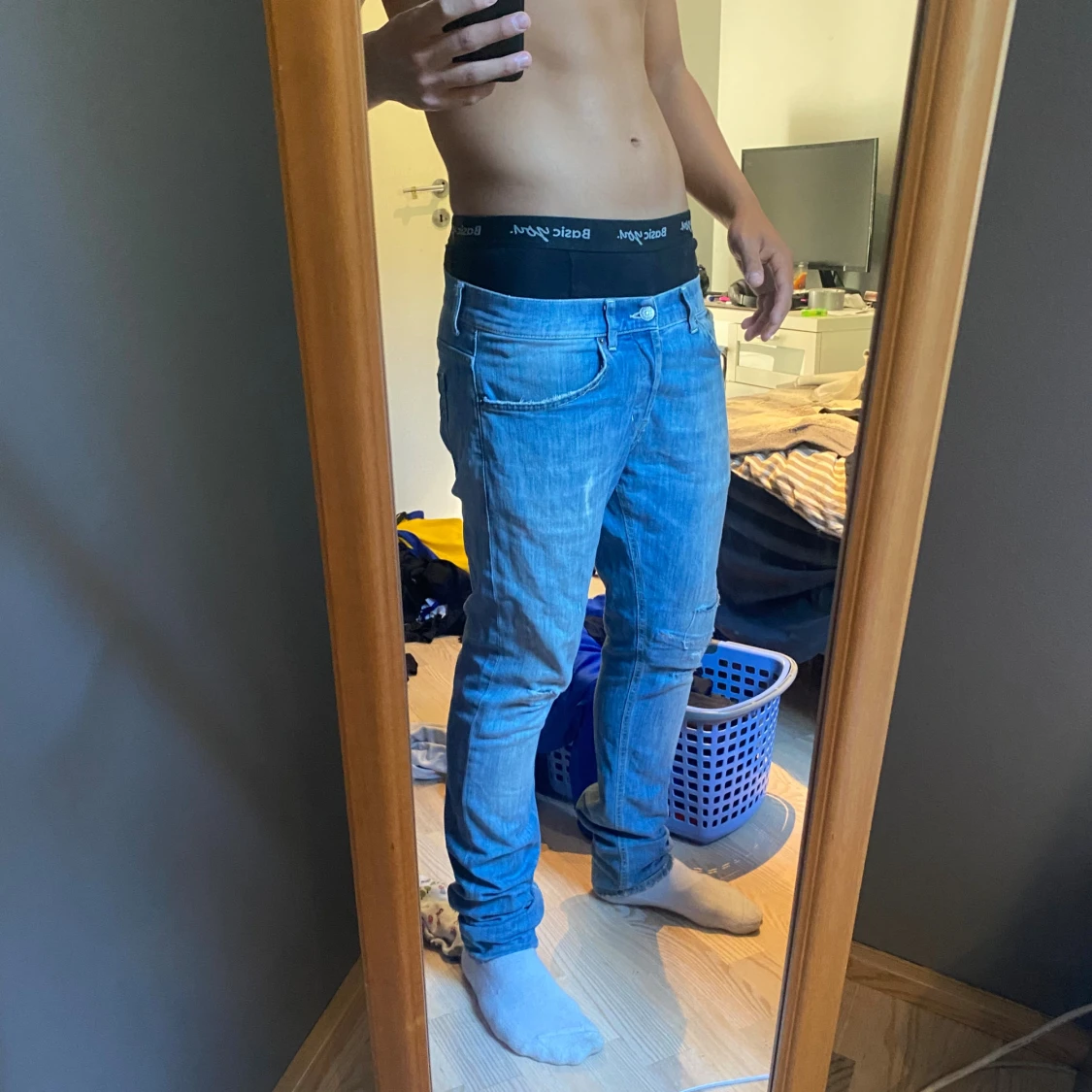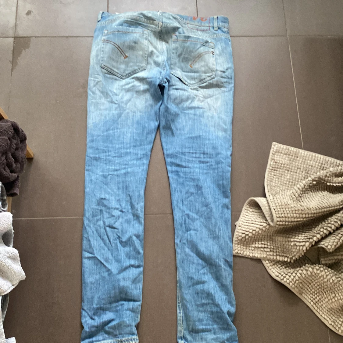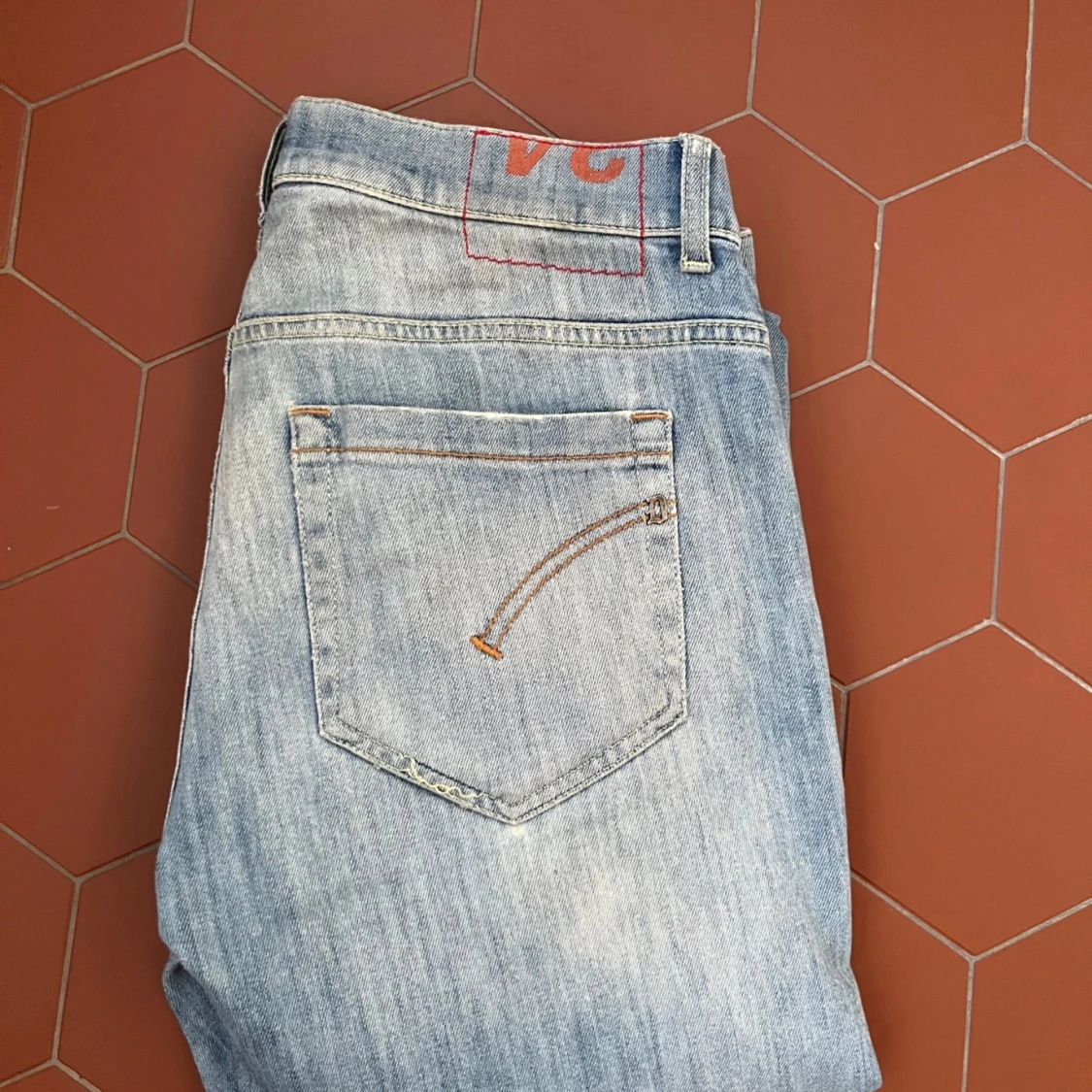 Säljer ett par ljusblå jeansbyxor från Dondup med klassisk femficksdesign och slitningar på framsidan. Jeansen har broderad detalj på bakfickorna! Pris kan diskuteras!😎