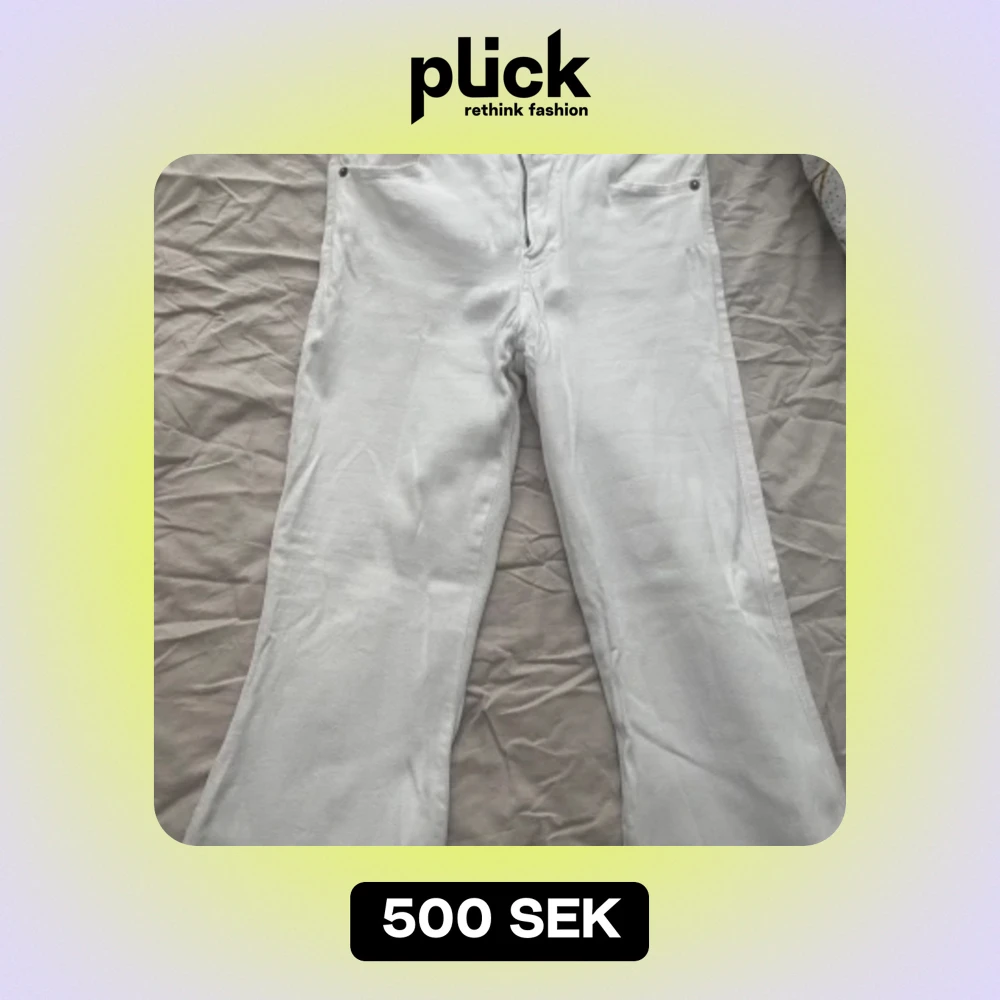 Vita kostymbyxor med bootcut - Snygga vita kostymbyxor med bootcut-snitt och låg midja. Byxorna har klassiska fickor fram och stängs med dragkedja och knapp. Materialet känns som bomull eller polyester och de har en clean, fräsch look som är lätt att matcha med olika toppar. Lite noppiga på vissa ställen.