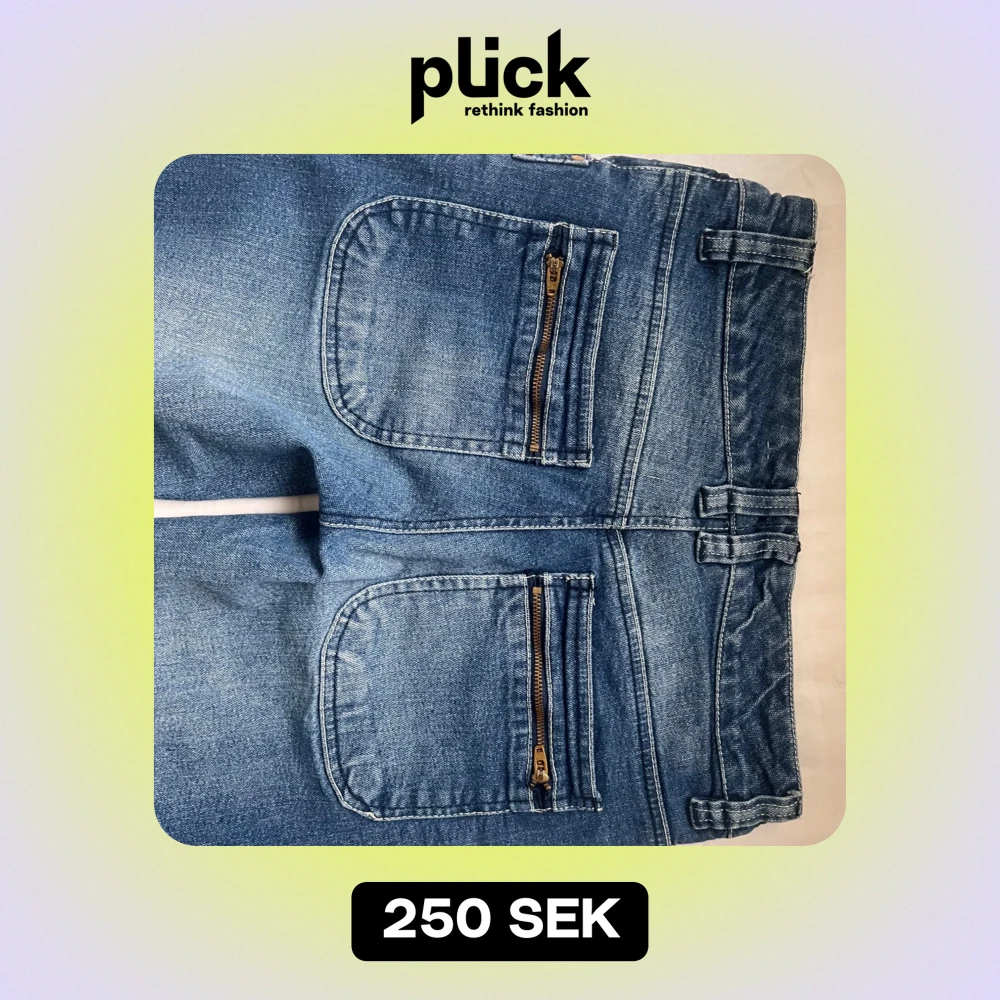 Säljer ett par snygga lågmidjade blå jeans i storlek 36. De har coola dragkedjor på bakfickorna och dubbla knappar fram. Perfekta för en avslappnad stil med en touch av edge. Passar bra till både vardag och fest!