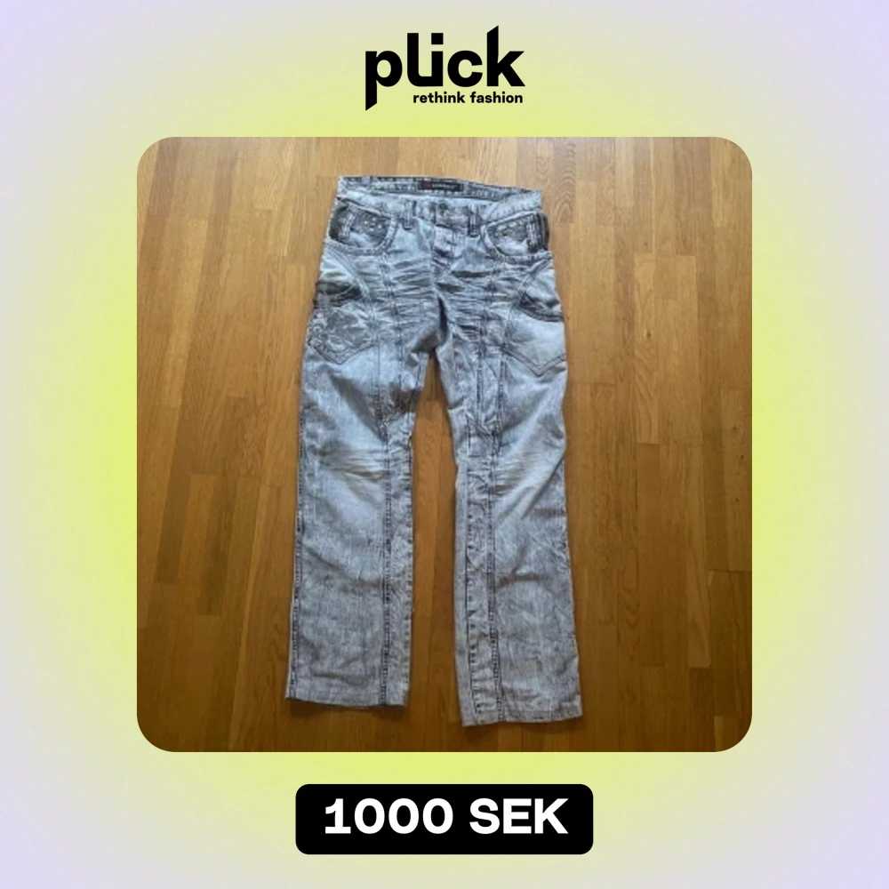 Robins och rock revival liknande jeans. Har rhinestones på och ovanför bakfickorna. Tar gärna trades mot trueys. Mått: Ytterben:105cm midja:43cm Benöppning 24cm