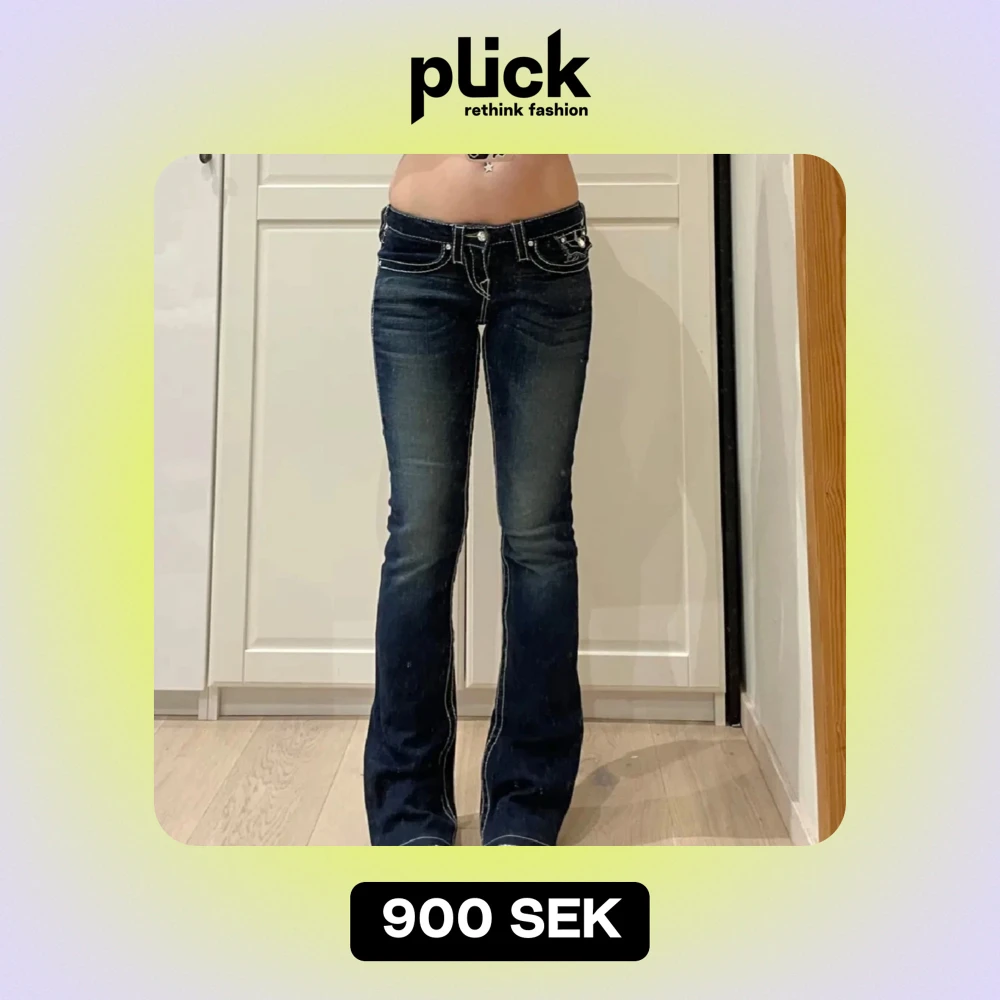 Säljer ett par snygga mörkblå true religion bootcut jeans i mycket bra skick. De har en låg midja och coola kontrastsömmar❤️köpte från plick och säljer vidare billigare då dom inte passade min stil❤️