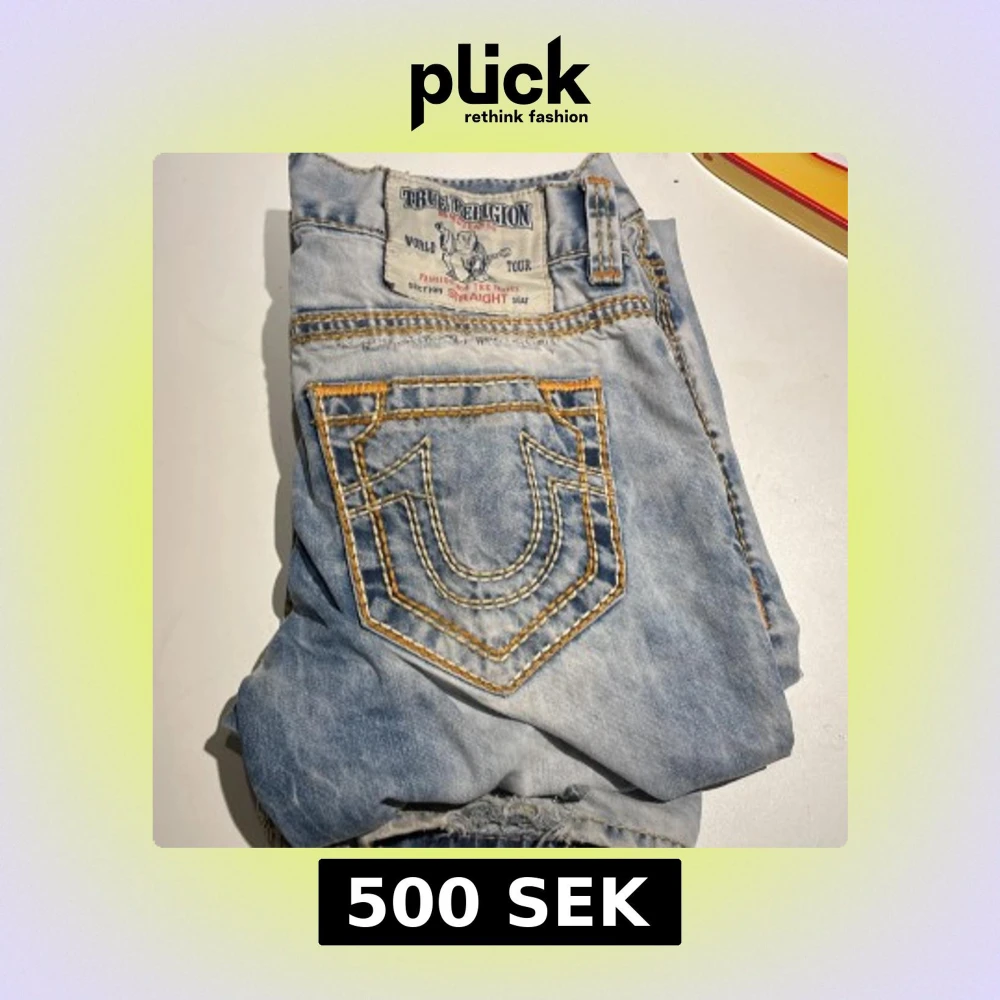 Säljer ett par ljusblå jeans från True Religion med slitna detaljer och kontrastsömmar. Jeansen har en straight passform och klassiska femficksdesign. Perfekta för en avslappnad stil.